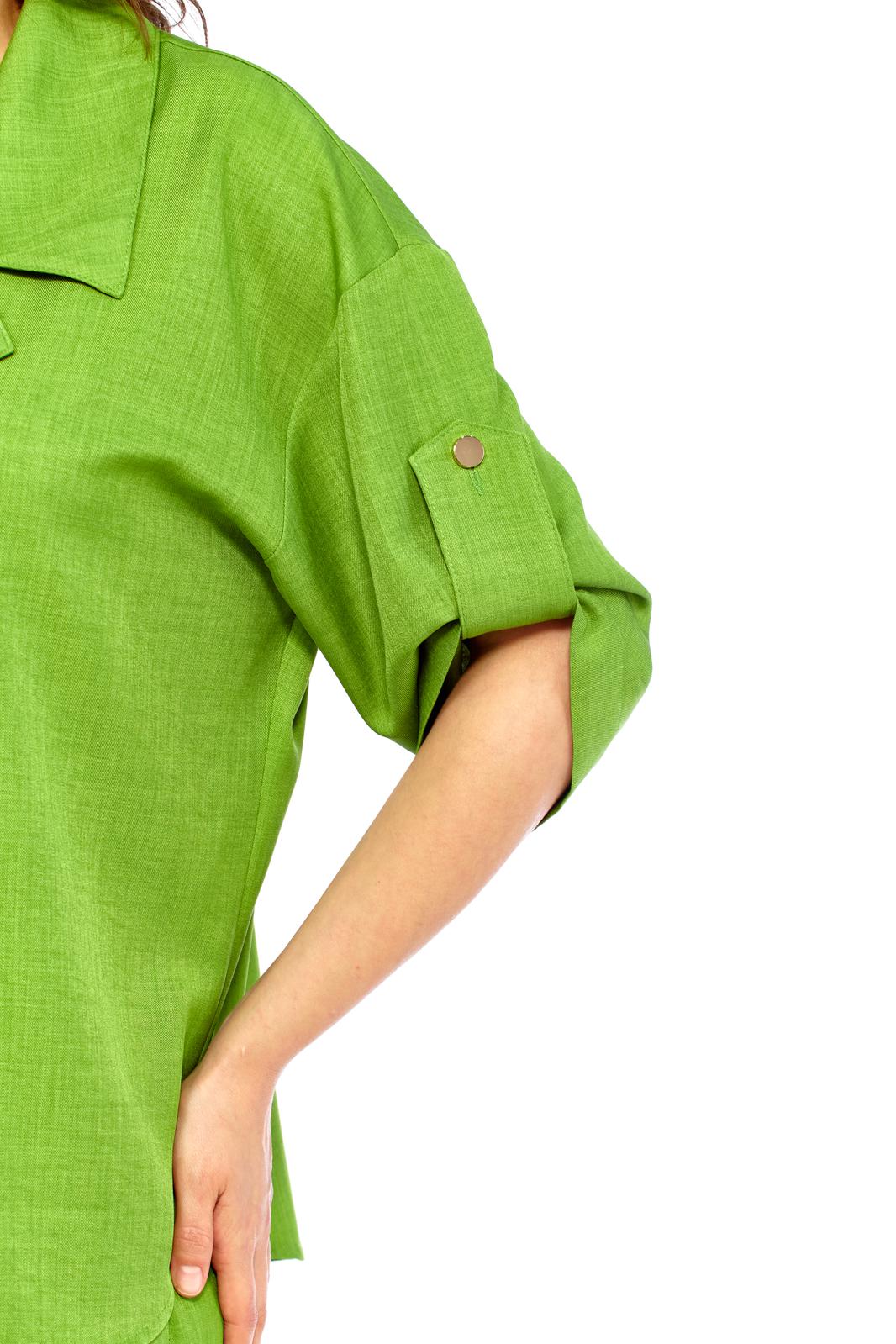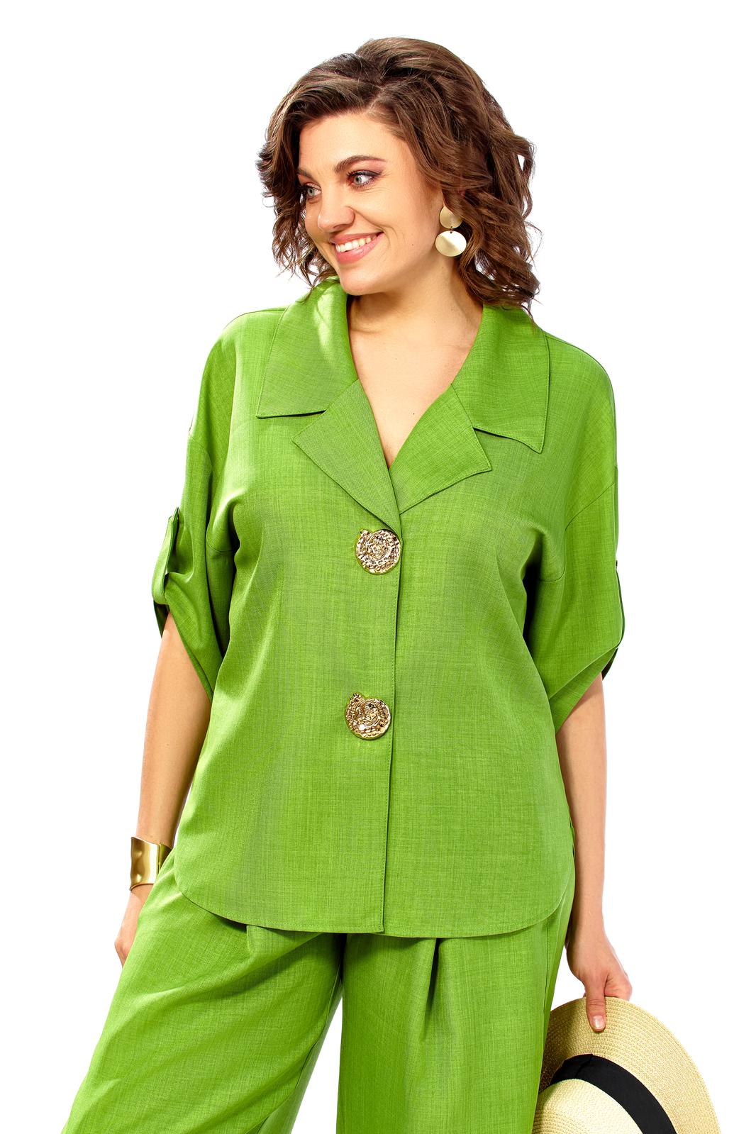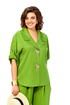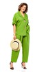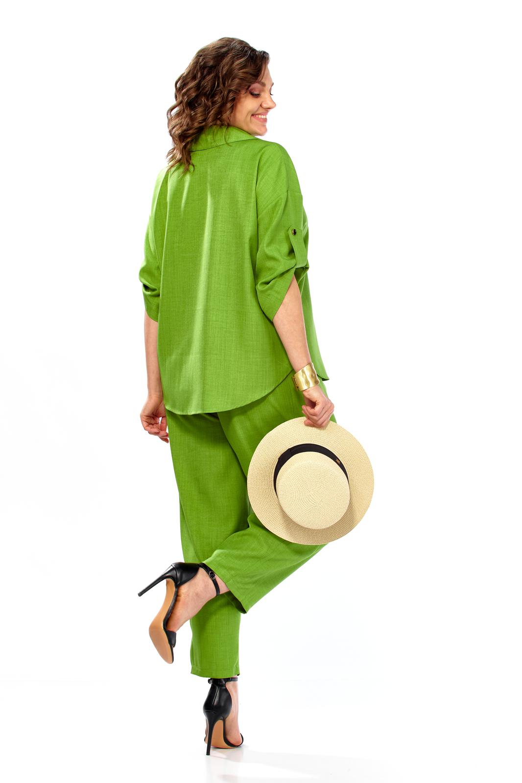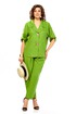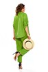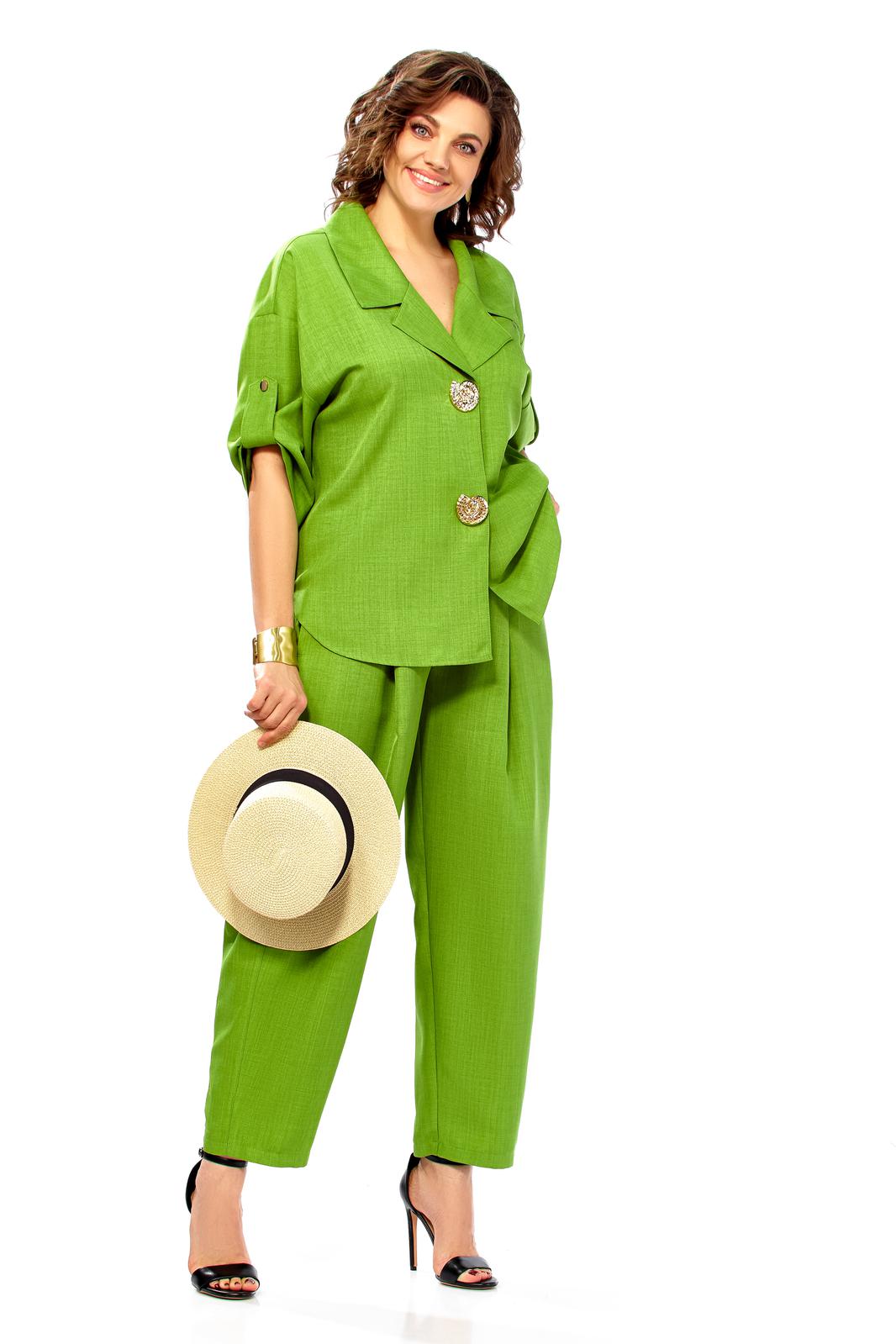 Шикарный костюм свободного силуэта. Застежка на две декоративные металлические кнопки. Воротник пиджачного типа. Рукав спущенный с патой, застегивающейся на пуговицу. Низ фигурной формы. Брюки свободные, зауженные к низу, с вертикальной вставкой вдоль бокового шва. По переду заложены односторонние складки. По спинке отрезная кокетка. Карманы в боковых швах. Верхний срез обработан притачным поясом.