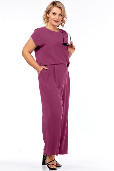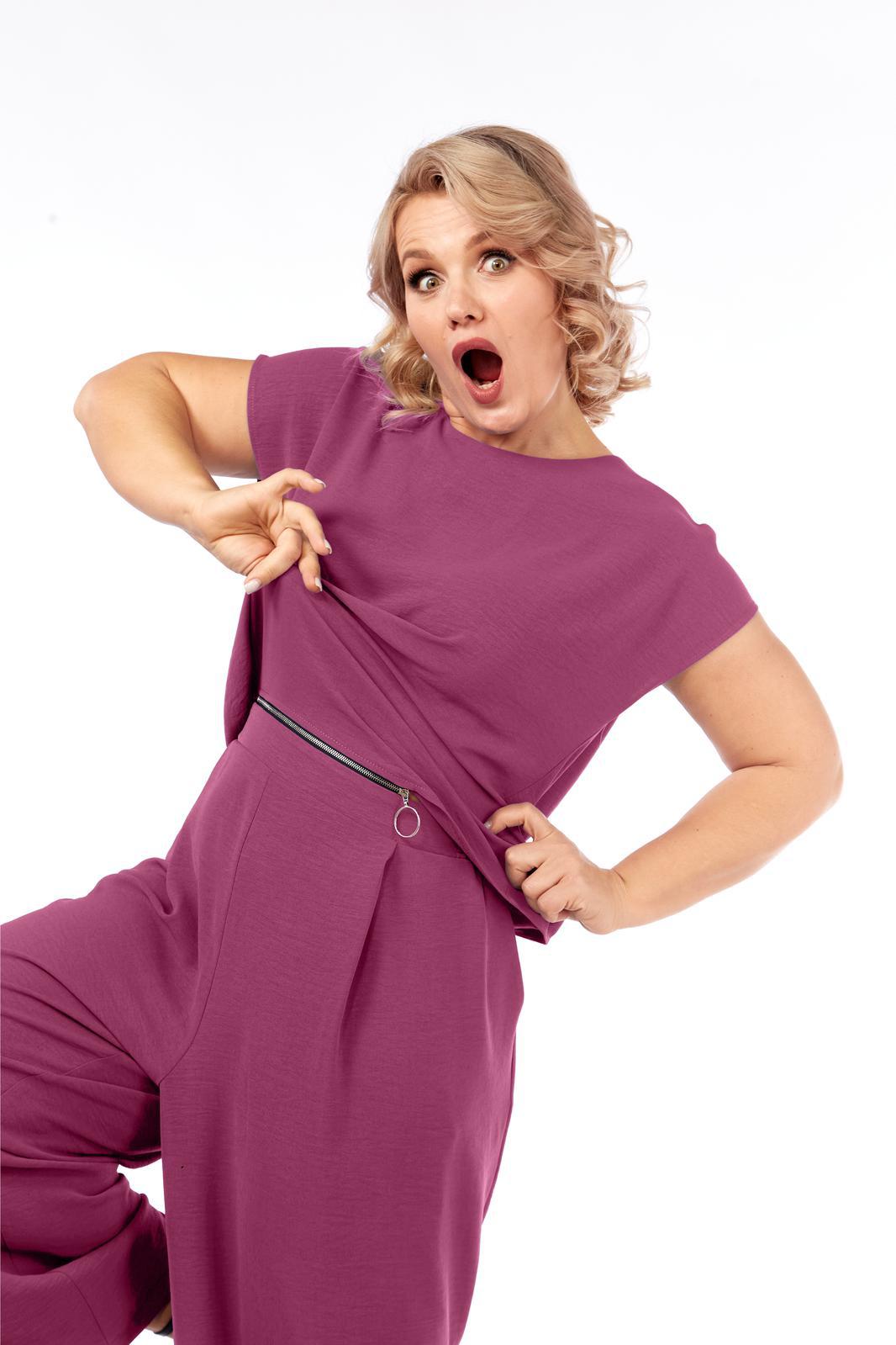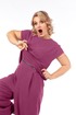 Костюм-комбинезон, свободного силуэта, костюм трансформируется в комбинезон молнием спереди по талии. Блузка прямая с цельнокроеным коротким рукавом. Брюки на поясе на резинке по спинке, свободного кроя. Карманы к боковым швам.