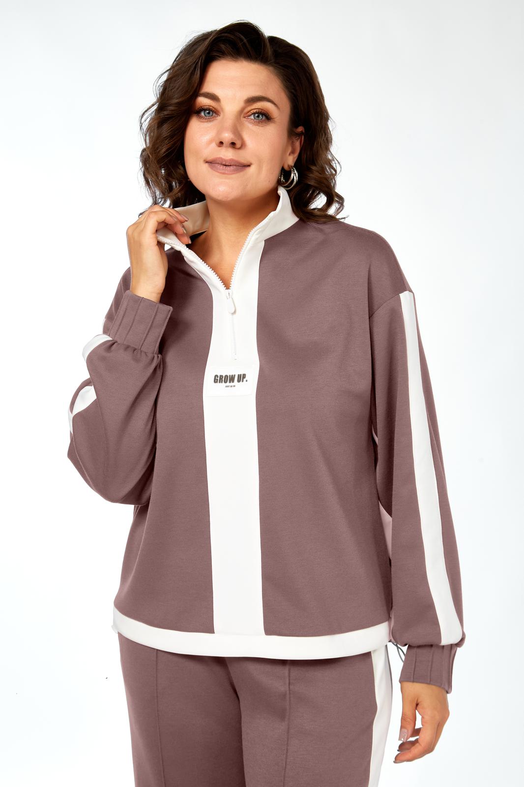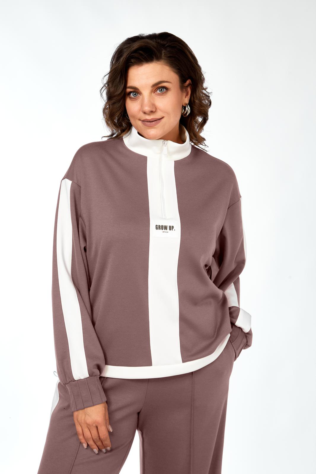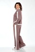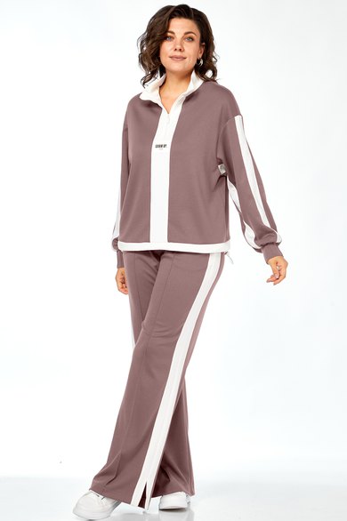 Костюм женский спорт-шик. Джемпер прямого силуэта, со спущенным рукавом. Воротник-стойка из отделочной ткани, планка по центру, в которой вставлена молния, декаротивная нашивка. Рукав с планками из отделочной ткани и декоративные защипы на манжетах. По низу кулиска с фиксаторами. Брюки прямые, по переду застрочены стрелки, по внешней стороне отделочные детали с разрезами по низу. Карманы в боковых швах, пояс на резинке.