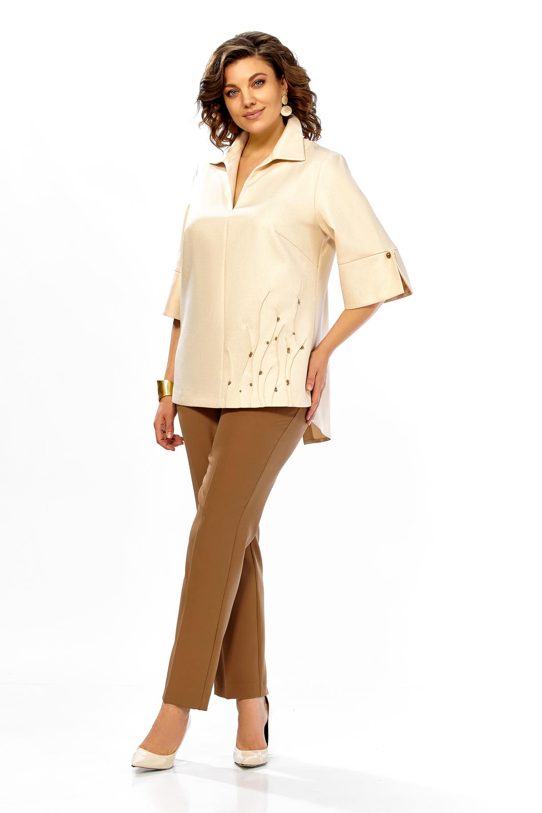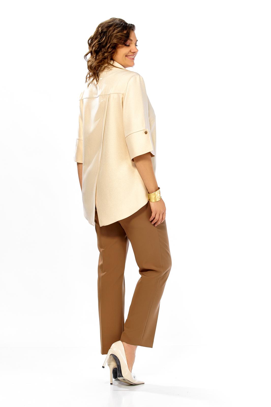 Комплект женский, состоит из блузы и брюк. Блузка из ткани с блеском. А брюки однотон. На блузе по центру шов, вырез горловины V-oбразной формы, с отложным воротником. По низу справа декоративный элемент в виде защипов и бусин пришивных. По спинке отрезная кокетка, от кокетки вниз детали на запах. Низ фигурной формы. Рукав ниже линии локтя, с притачной манжетой и отделочными пугавицами. Брюки слегка зауженные к низу со стрелками. Брюки на поясе, с застежкой на молнию, по спинке резинка.