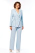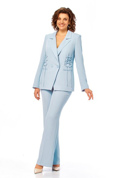 Костюм полуприлегающего силуэта. Элегантный костюм с интересным кроем не оставит Вас равнодушной. Жакет на подкладке с воротником пиджачного типа. Срез борта фигурной формы. По переду рельефы, между которыми декоративный элемент в виде шнуровки. Прорезные карманы в рамку, спинка со средним швом и рельефами. Рукав длинный двухшовный. Брюки слегка расклешенные, на поясе, с застежкой на молнию и петлю и пуговицу. По спинке пояс на резинке. Заутюженные канты по передним и задним полотнищам. Карманы к боковым швам.