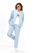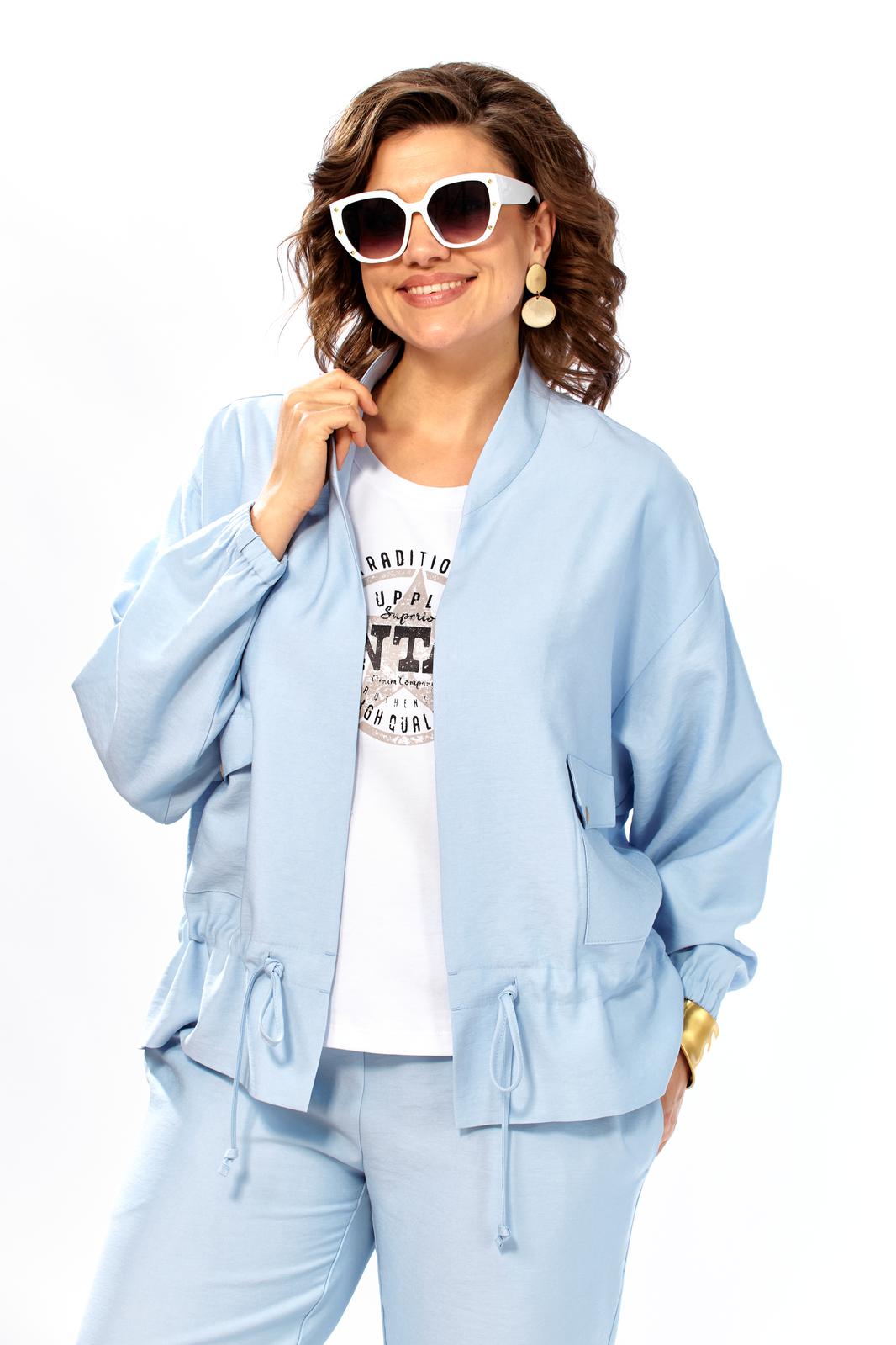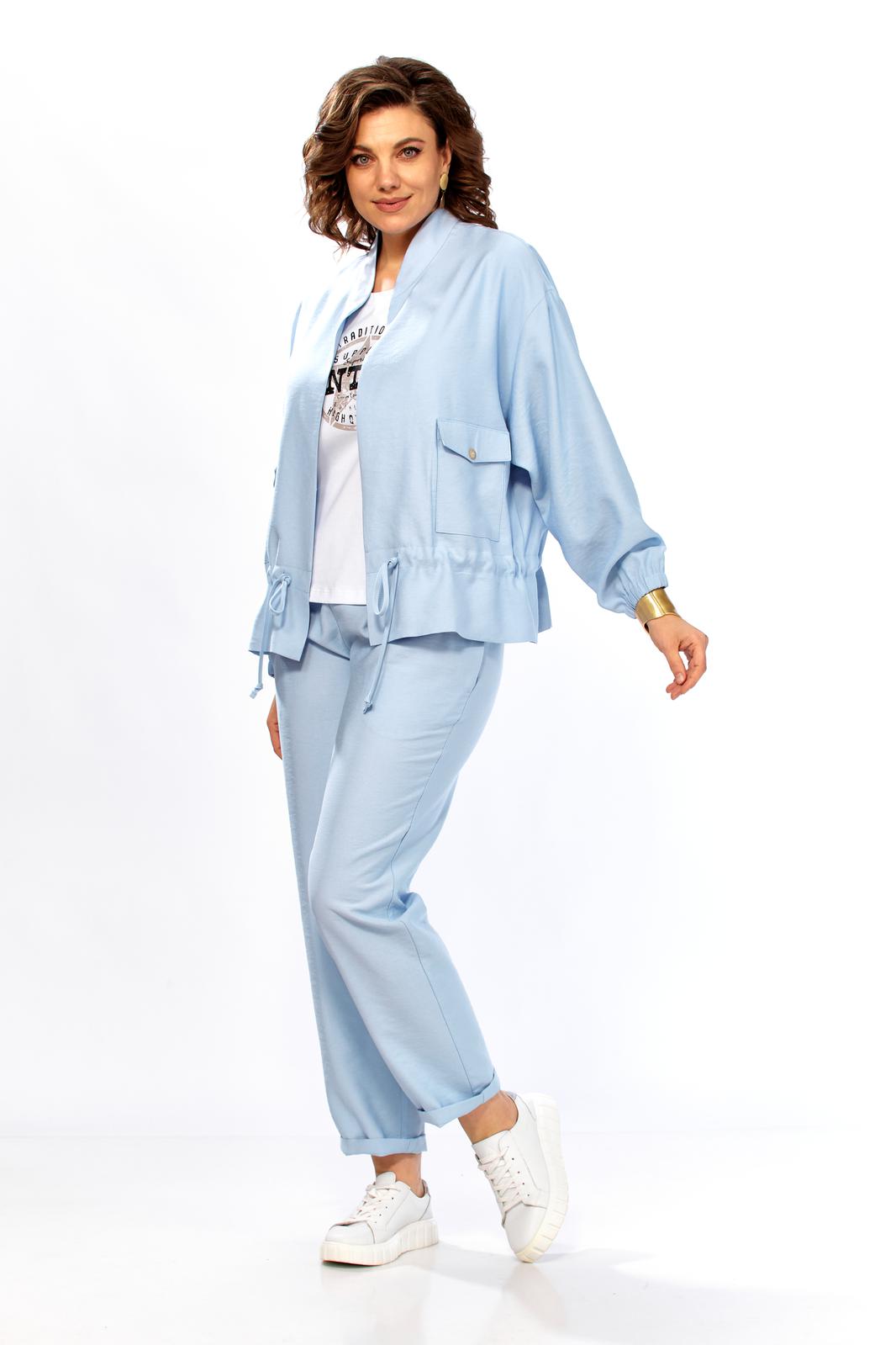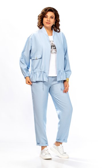Комплект женский: жакет, блузка, брюки. Жакет со спущенным рукавом, центральной застежкой на магниты и воротником стойкой. На переде обработаны накладные карманы с клапанами. По спинке отрезная кокетка. По низу кулиска по талии. Длинный рукав, на резинке. Брюки заужены к низу с карманами в боковых швах. Верхний срез брюк на поясе частично на резинке. Блузка с округлым вырезом горловины, коротким рукавом и термоапликацией по переду.