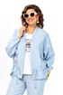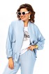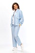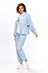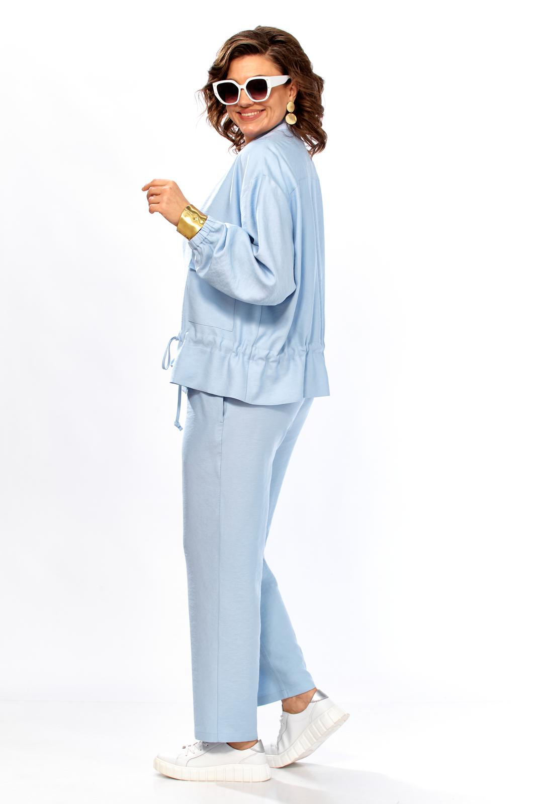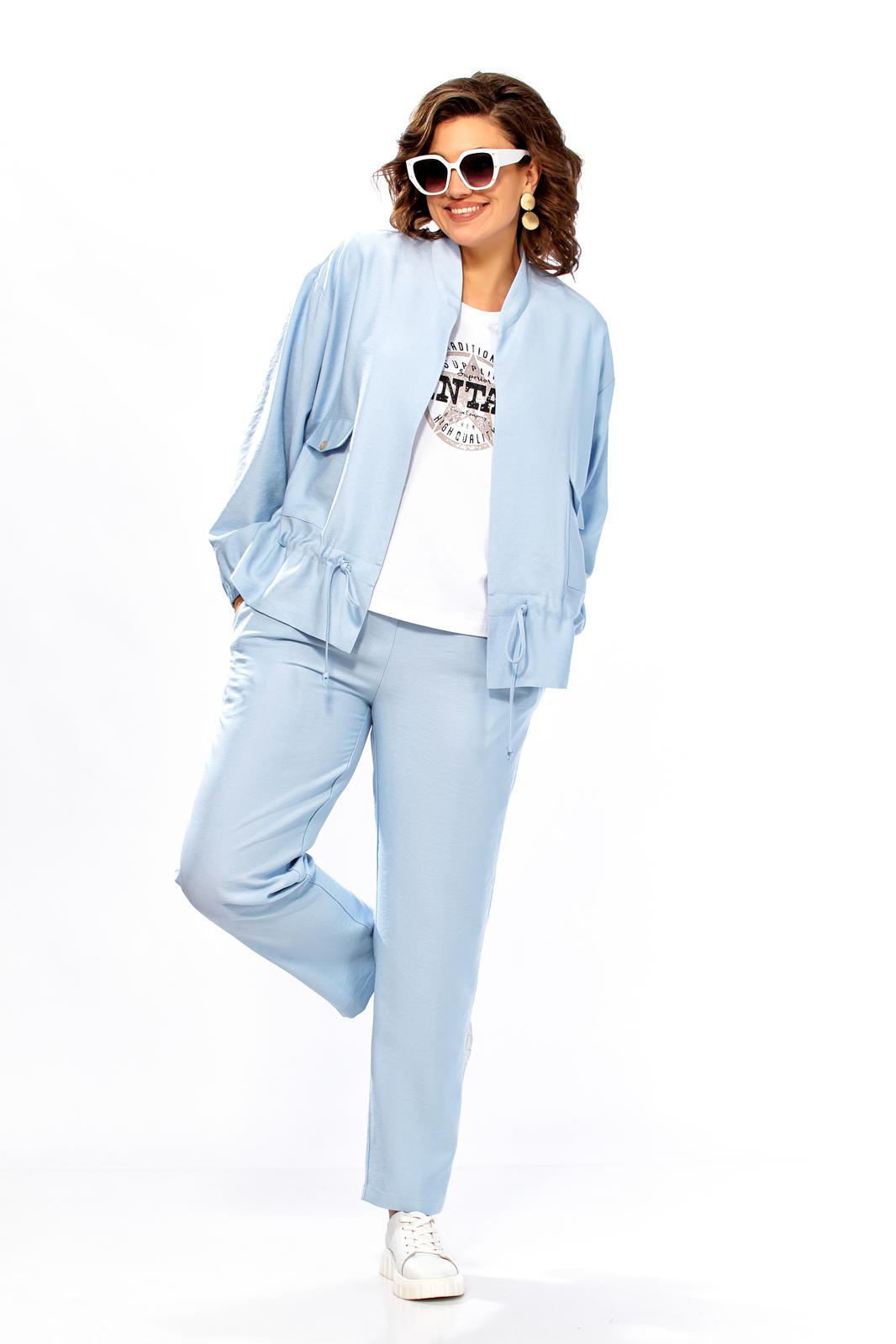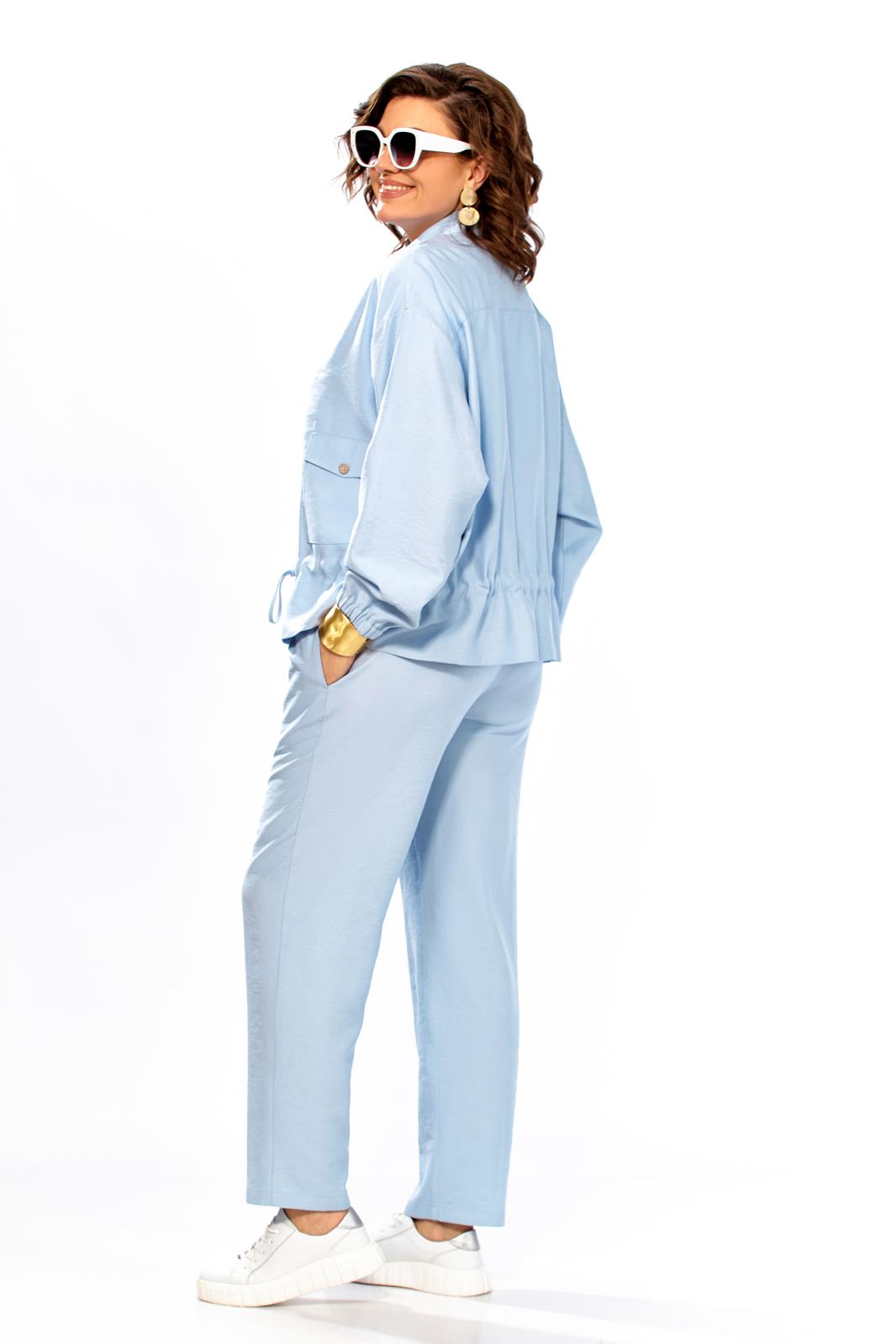 Комплект женский: жакет, блузка, брюки. Жакет со спущенным рукавом, центральной застежкой на магниты и воротником стойкой. На переде обработаны накладные карманы с клапанами. По спинке отрезная кокетка. По низу кулиска по талии. Длинный рукав, на резинке. Брюки заужены к низу с карманами в боковых швах. Верхний срез брюк на поясе частично на резинке. Блузка с округлым вырезом горловины, коротким рукавом и термоапликацией по переду.