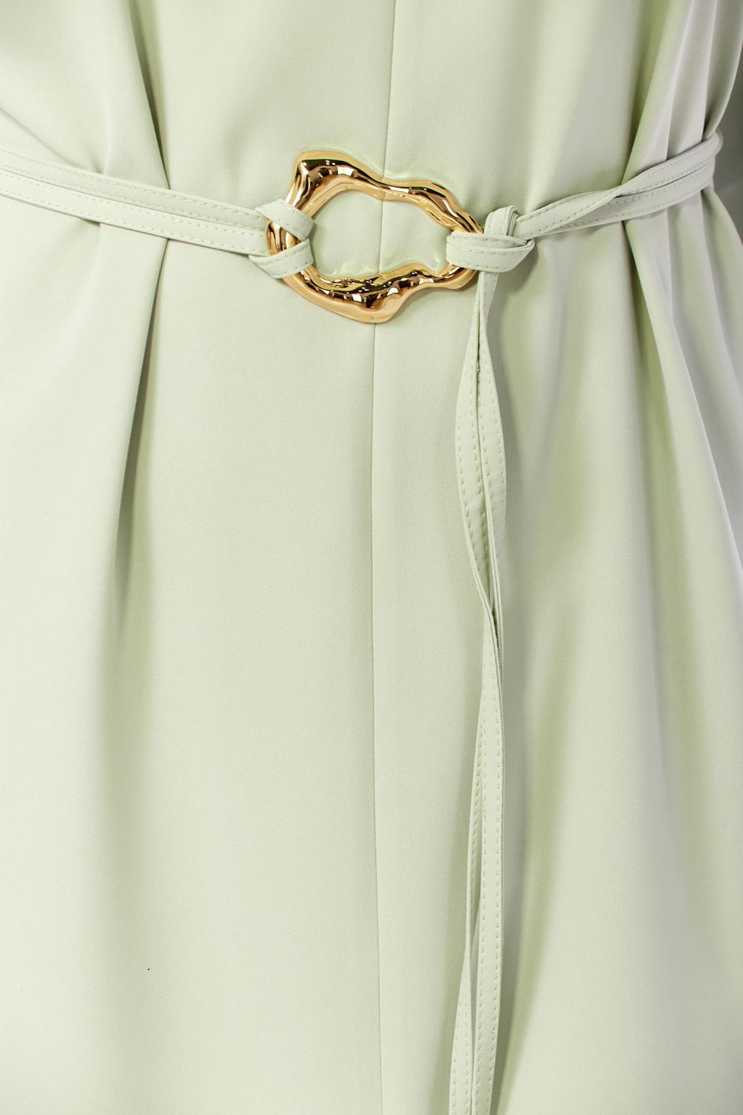 Платье женское, полуприлегающего силуэта со спущенным рукавом. Вырез горловины округлый, по переду центральный шов, в верхней части которого разрез с декоративной булавкой, по низу разрез. Спинка со средним швом и потайной молнией. Оригинальный пояс с декоративной пряжкой.