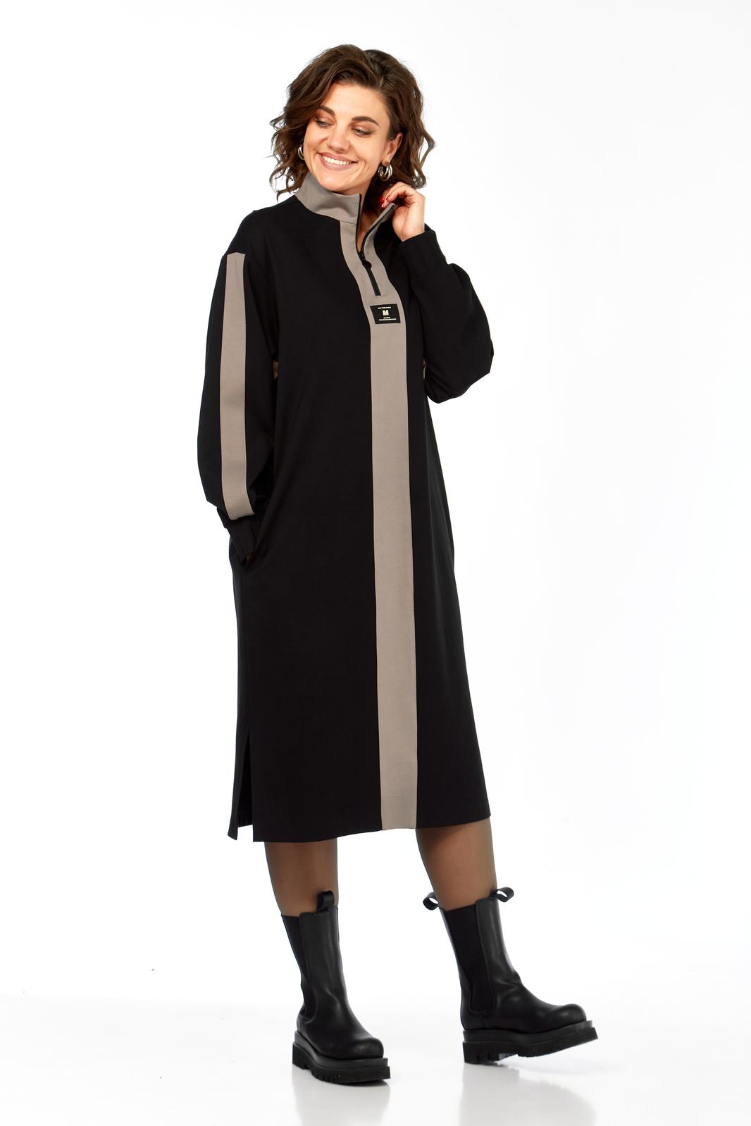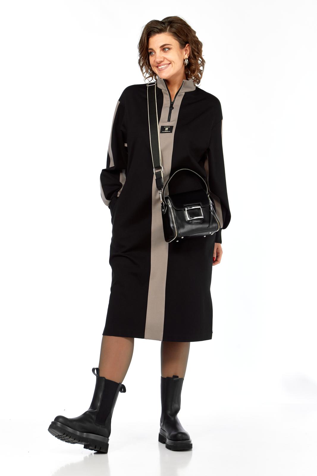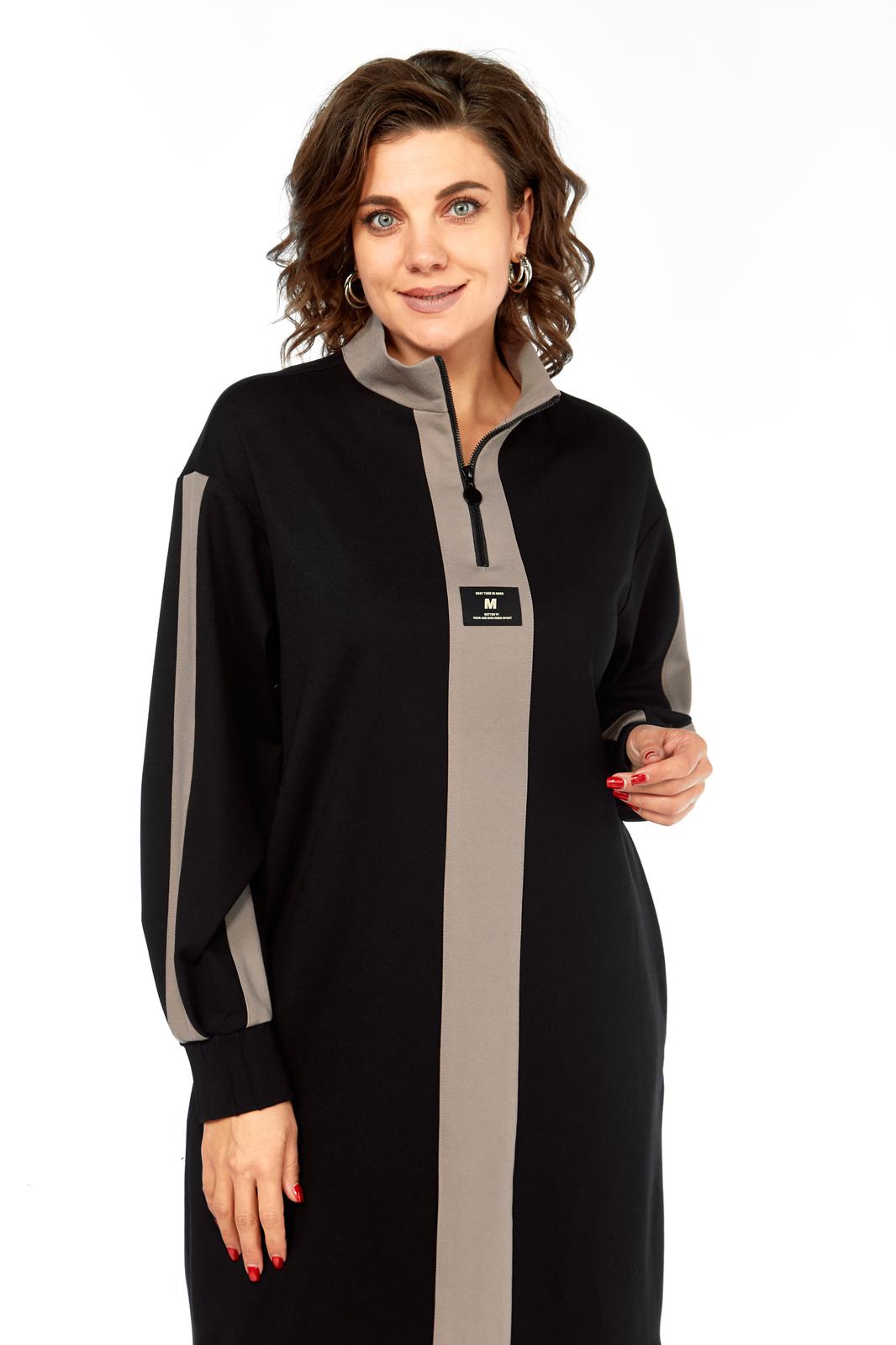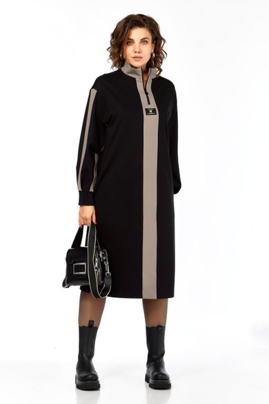 Платье в стиле спорт-шик прямого силуэта, с воротником-стойкой. По переду, по центру контрастная отделка, молния, переходящая в воротник, декоративная нашивка. В боковых швах карманы и разрезы в низу. Рукав апущенный на манжете, с контрастными полосками.