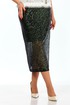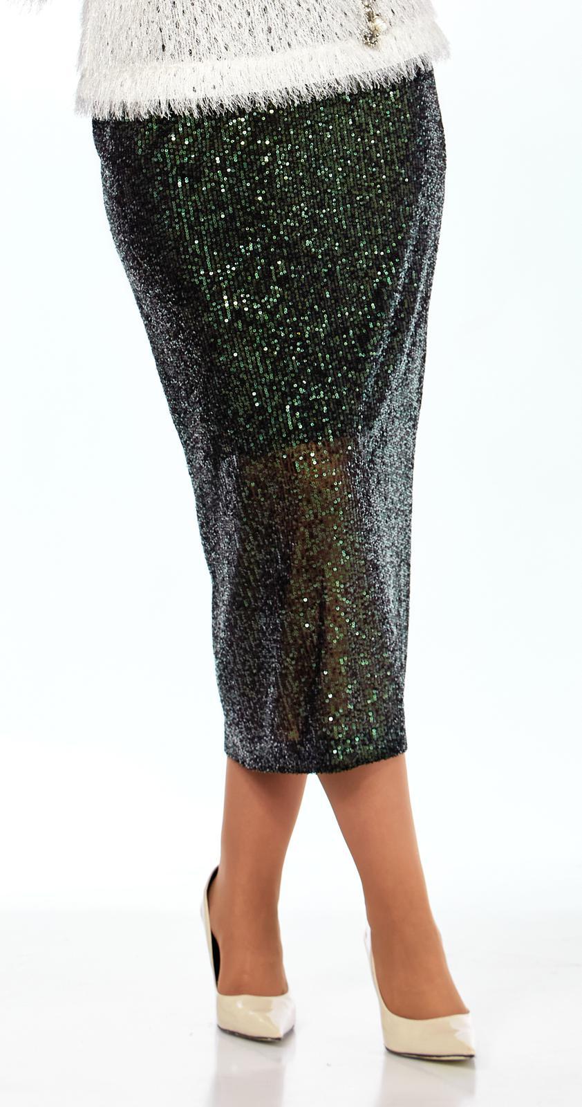 Юбка длиной миди из ткани в паетки, на поясе (резинка по бокам) из отделочной атласной ткани. По спинке средний шов с потайной молнией, заканчивающийся разрезом . Юбка на подкладке.