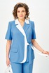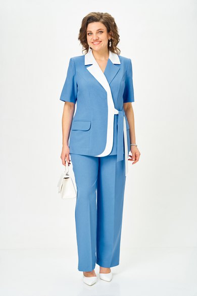 Жакет полуприлегающего силуэта, удлиненный, двубортный с застежкой на завязывающиеся пояса контрастных цветов. На правой части переда по краю борта вставка из контрастной ткани, край борта закругленный. Горловина оформлена воротником пиджачного типа – верхний воротник и правый лацкан из отделочной ткани. Перед с рельефами из проймы, в нижней боковой части выполнен прорезной карман в рамку и клапаном. Спинка со средним швом и двумя рельефами. Рукав втачной, одношовный, короткий.