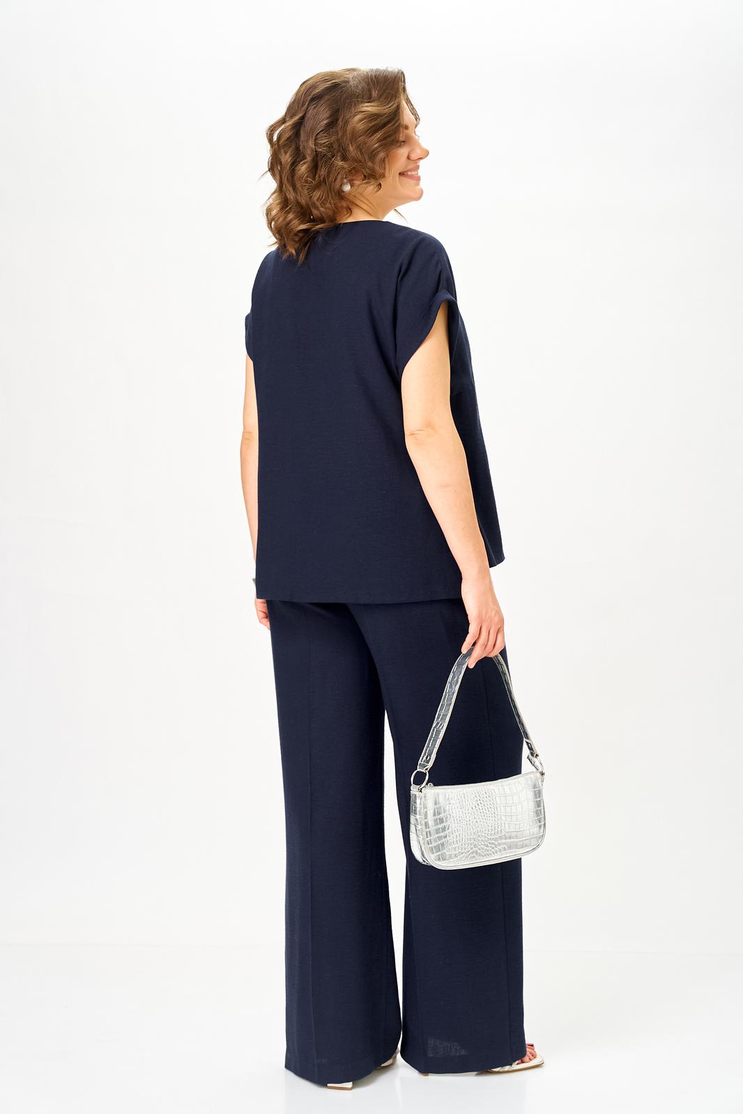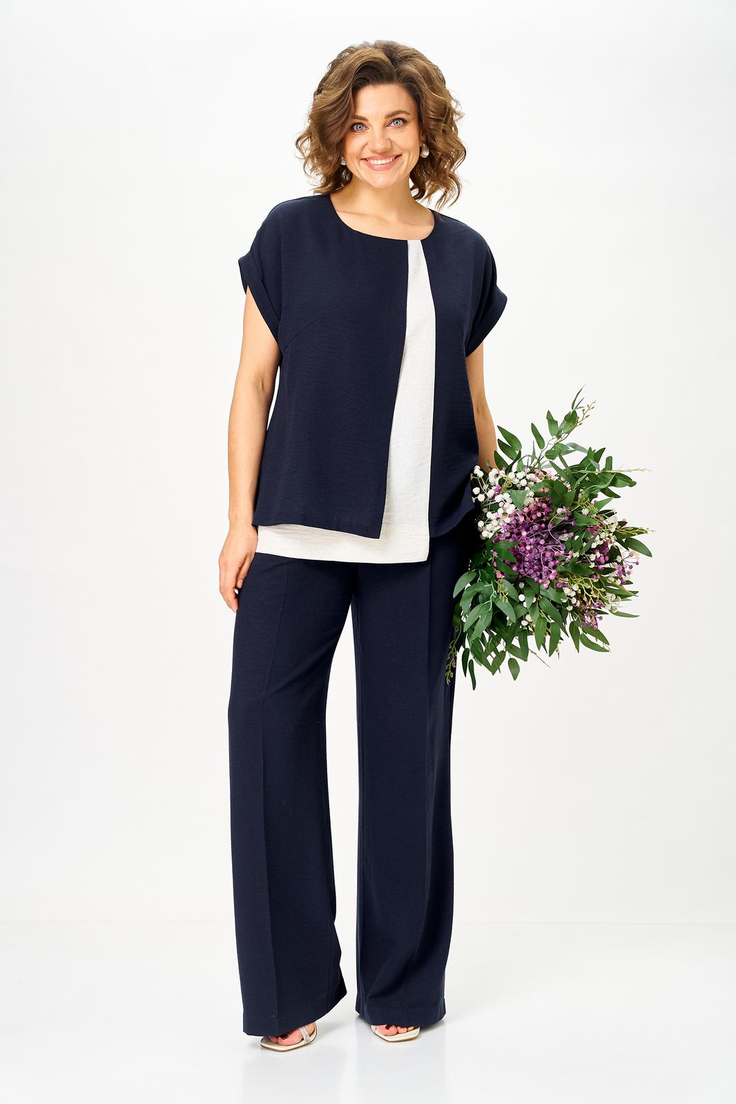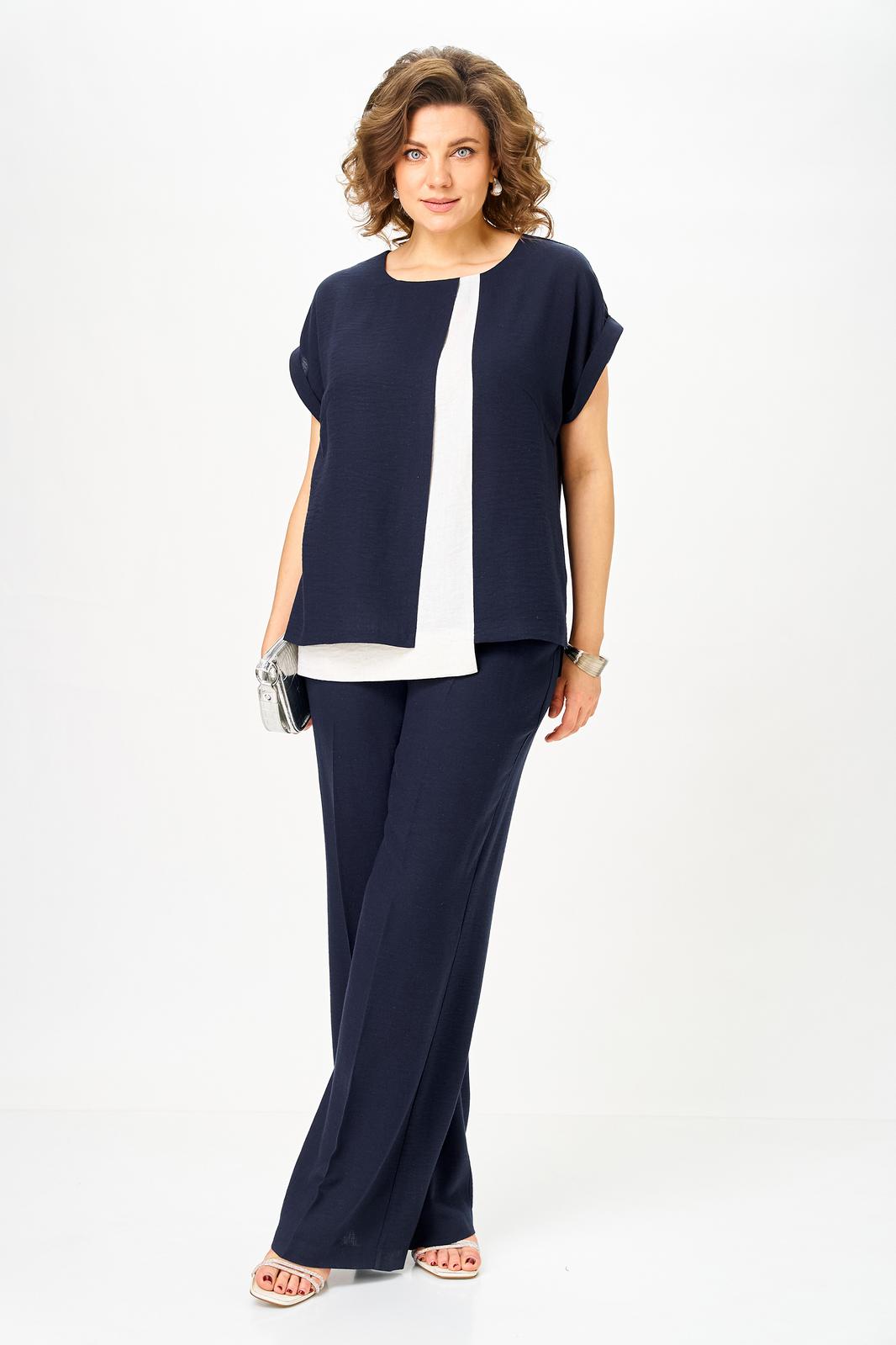 Комплект женский, состоящий из блузы и брюк, выполнен из однотонной ткани со вставкой из светлой ткани.