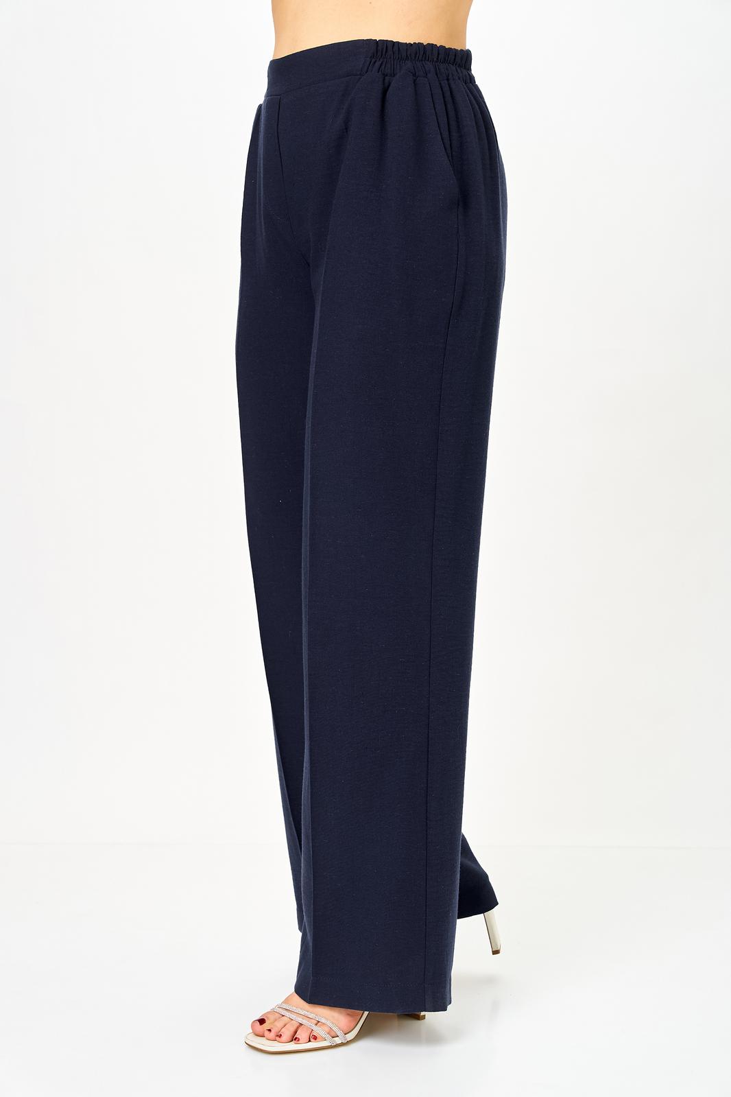 Брюки прямые, свободной формы. В боковых швах выполнены наклонные карманы. Верхний срез обработан поясом с резинками по боковым швам и имитацией застежки.