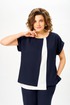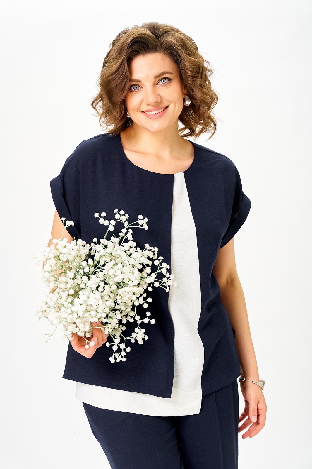Блуза свободной формы со спущенным плечом, без рукавов. Блуза имеет О-образный вырез, разрезы по боковым швам и планки с отворотами по пройме. Перед блузы с нагрудными вытачками и вставкой из отделочной ткани, правая часть переда отлетная.