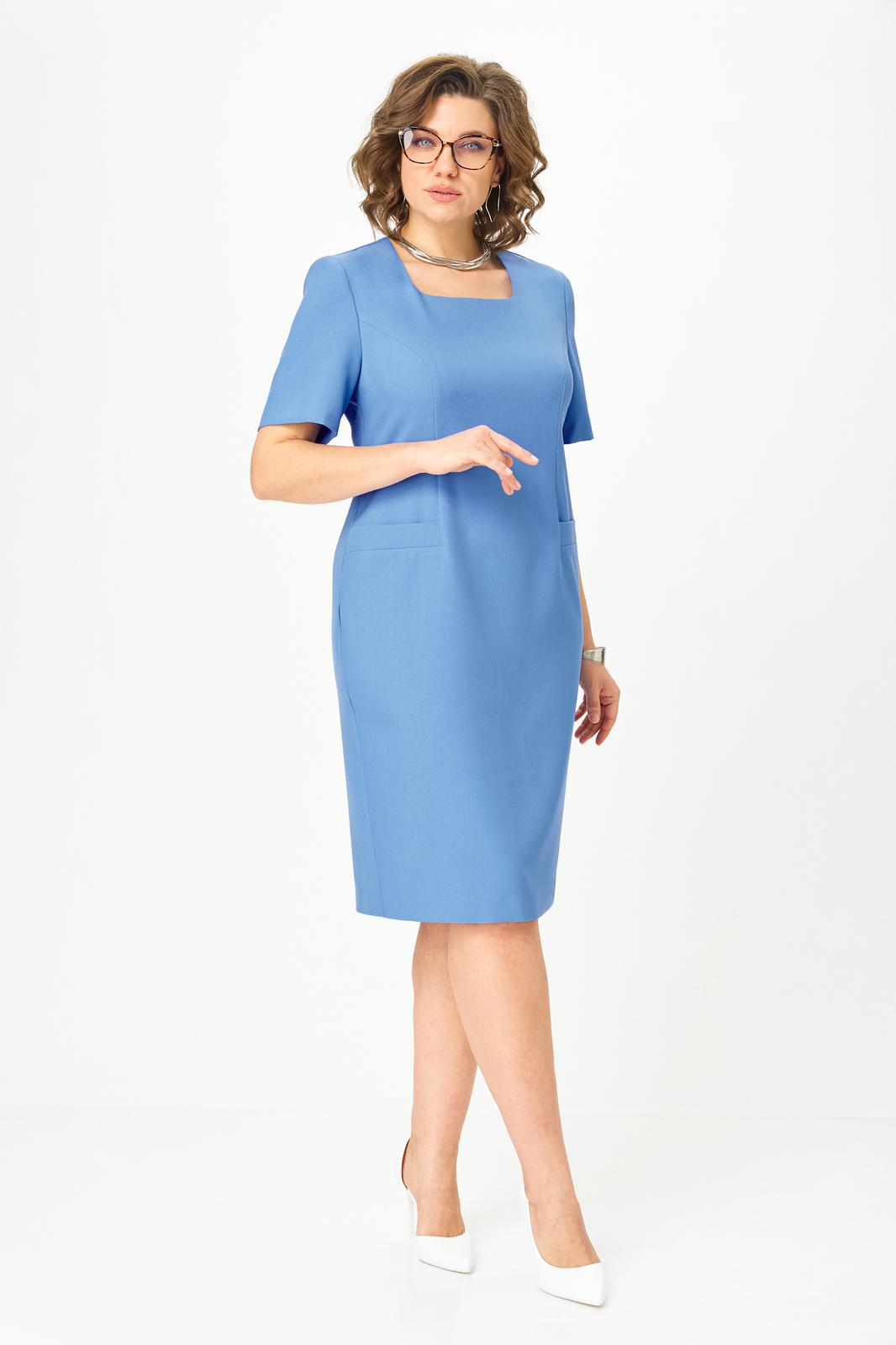 Платье полуприлегающего силуэта, зауженное к низу. По переду полурельеф, переходящий в подрез, в который вшита листочка. Вырез квадратной формы. Рукав короткий, одношовный. По спинке средний шов, сверху с потайной молнией, снизу с разрезом, а так же талиевые вытачки.