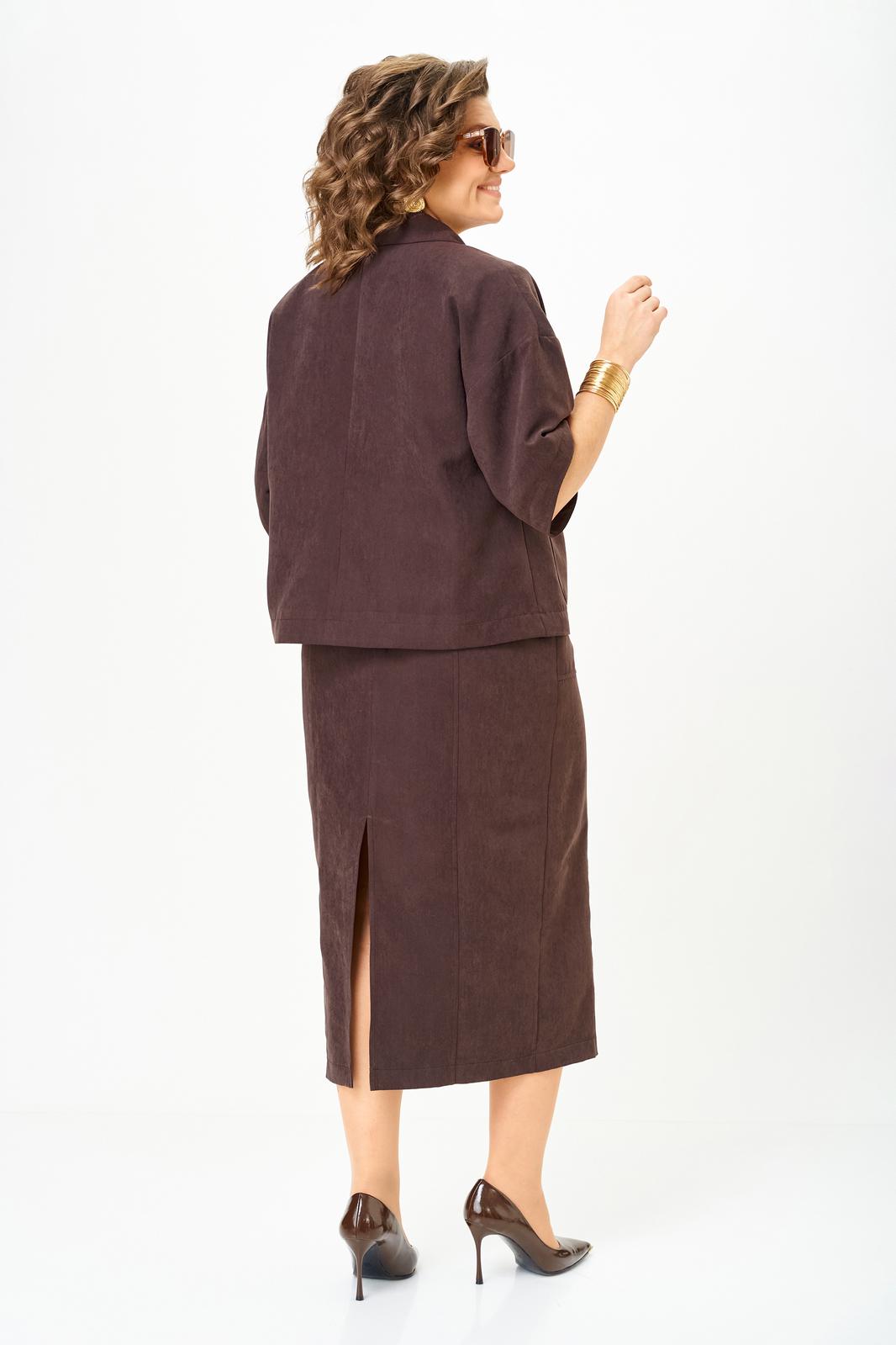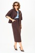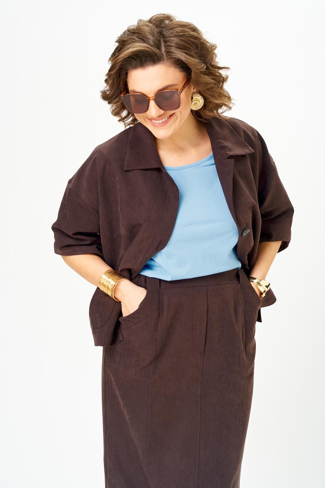 Комплект женский, состоящий из жакета и юбки, выполнен из однотонной костюмно-плательной ткани, блуза выполнена из трикотажного полотна.