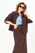 Жакет прямого силуэта, укороченный, со спущенными плечами. Застежка на петли-пуговицы доверху, горловина оформлена стояче-отложным воротником. Перед с нагрудной вытачкой с бокового шва и снизу с большими накладными карманами. Спинка со средним швом. Рукав одношовный, прямой, чуть ниже локтя, с фигурной линией низа, обработан обтачкой. Жакет без подклада.