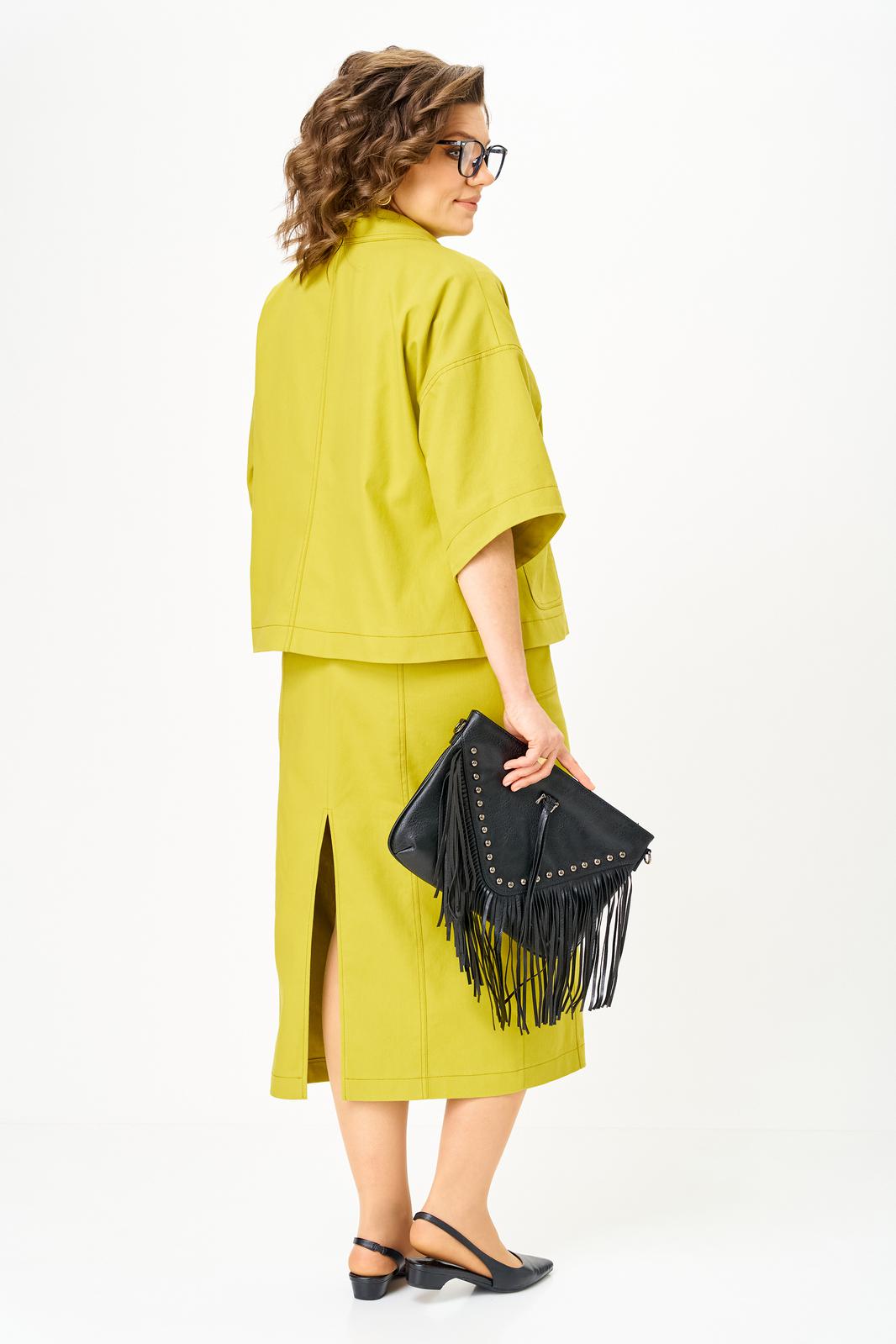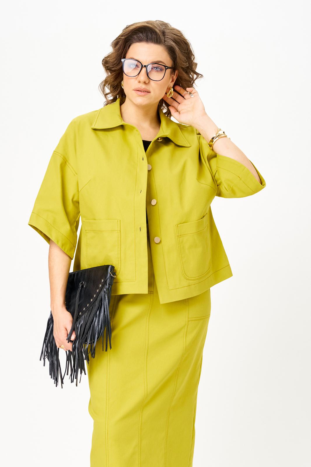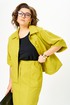 Жакет прямого силуэта, укороченный, со спущенными плечами. Застежка на петли-пуговицы доверху, горловина оформлена стояче-отложным воротником. Перед с нагрудной вытачкой с бокового шва, снизу с большими накладными карманами. Спинка со средним швом. Рукав одношовный, прямой, чуть ниже локтя, с фигурной линией низа, обработан обтачкой. Жакет без подклада.