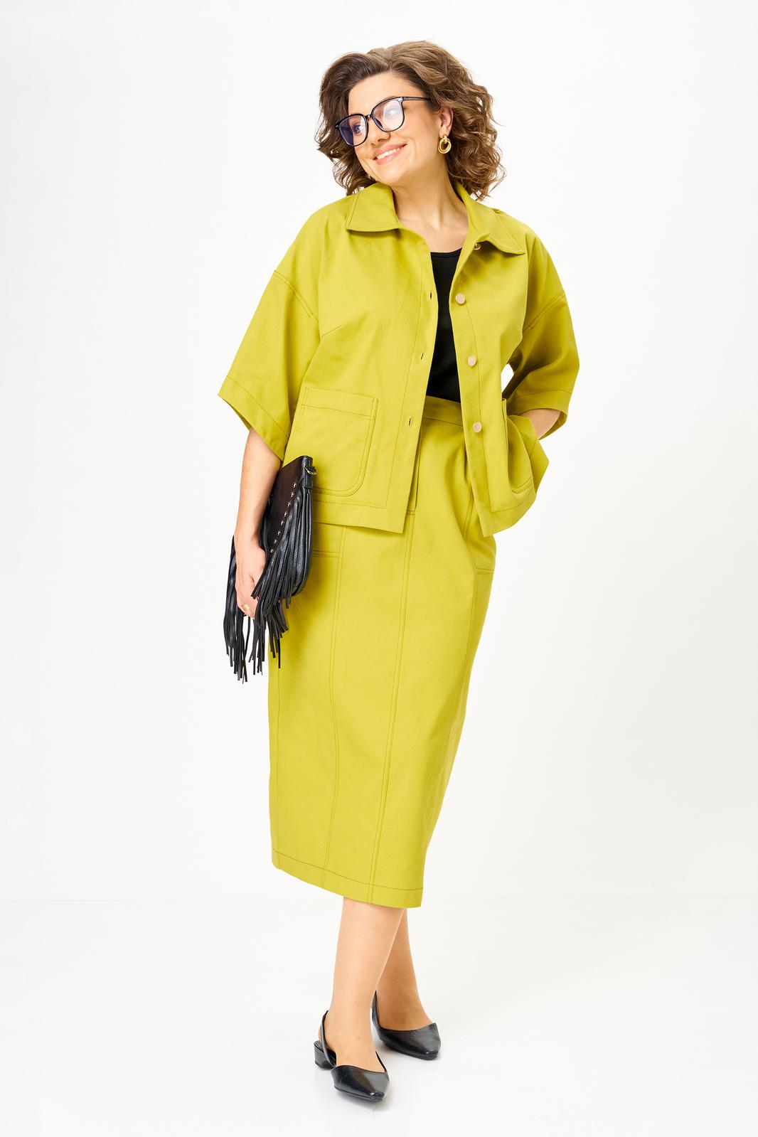 Комплект женский, трехпредметный, состоящий из жакета, блузы и юбки, выполнен из джинсовой ткани, блуза выполнена из трикотажного полотна.