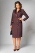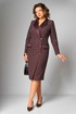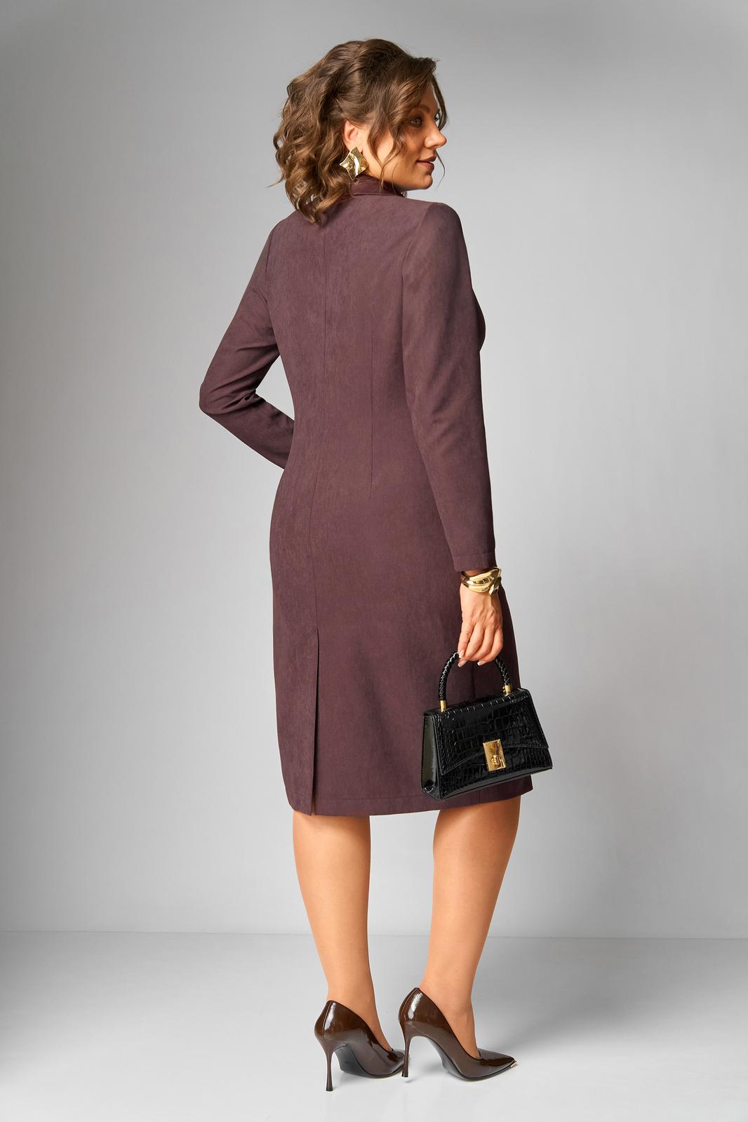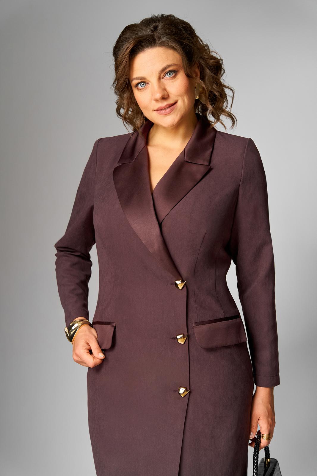 Платье женское, полуприлегающего силуэта, зауженное к низу, с двубортной застежкой (правая часть имеет слегка наклонную линию) на 3 отделочные пуговицы. На спинке средний шов, заканчивающийся шлицей и талиевые вытачки. По переду отрезной бочок, заканчивающийся в области бедер и нагрудная вытачка, в горизонтальном подрезе, в котором выполнен прорезной карман с двумя рамками и клапаном. Горловина оформлена воротником пиджачного типа. Рукав втачной, одношовный, длинный. Воротник, лацкан, клапаны и рамки кармана из атласной ткани.