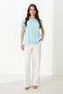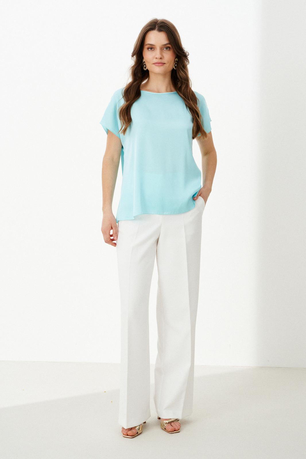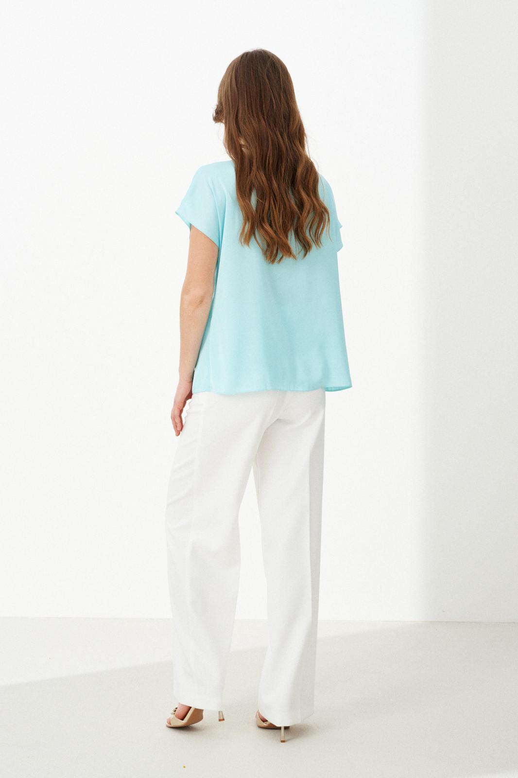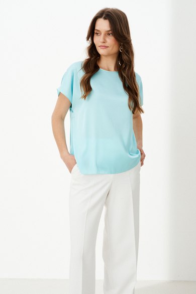 Эта женская базовая блуза прямого силуэта бирюзового оттенка — универсальный и стильный выбор для вашего гардероба. Она отлично сочетается с юбками, брюками и джинсами, создавая разнообразные образы для повседневной носки. Легкая и комфортная, блуза выполнена из приятной на ощупь ткани с гладкой поверхностью, которая не парит даже в жаркую погоду. Свободный крой с опущенной линией плеча и короткими цельнокроеными рукавами обеспечивает безупречную посадку и комфорт. Обработанная узкой планкой горловина придает изделию аккуратный вид. Ее легко стирать в машинке, она быстро сохнет и сохраняет форму после стирки. Купите эту блузу и создавайте множество стильных образов для любого дня!