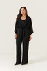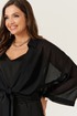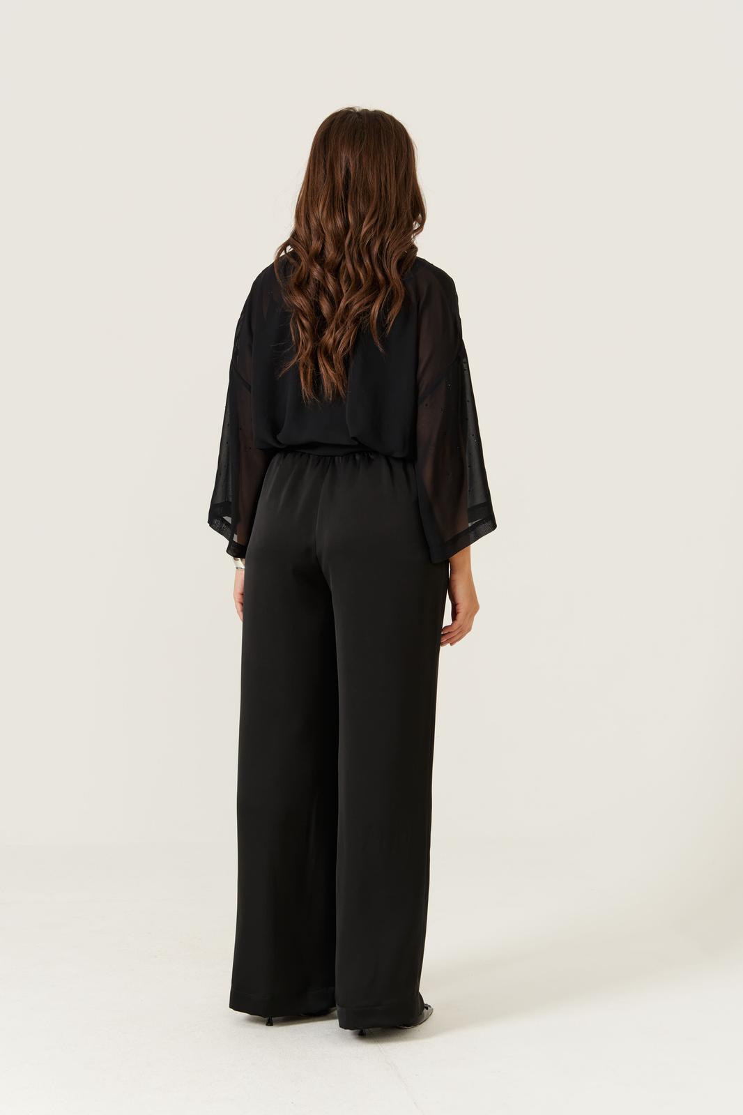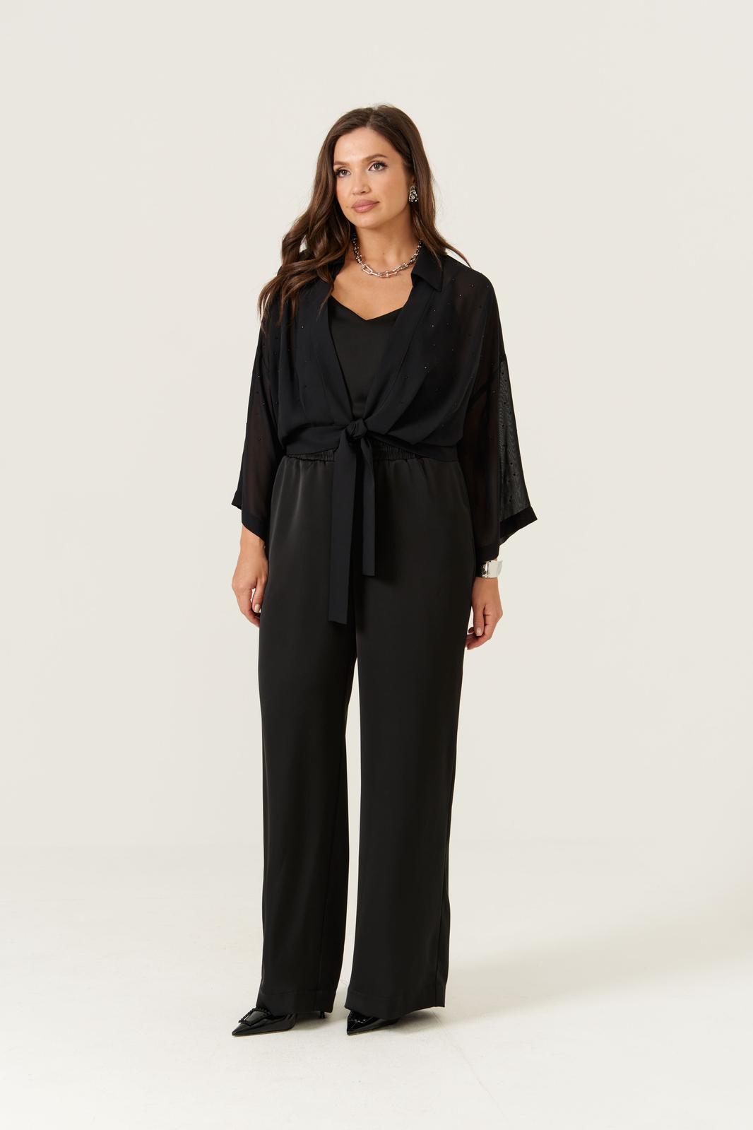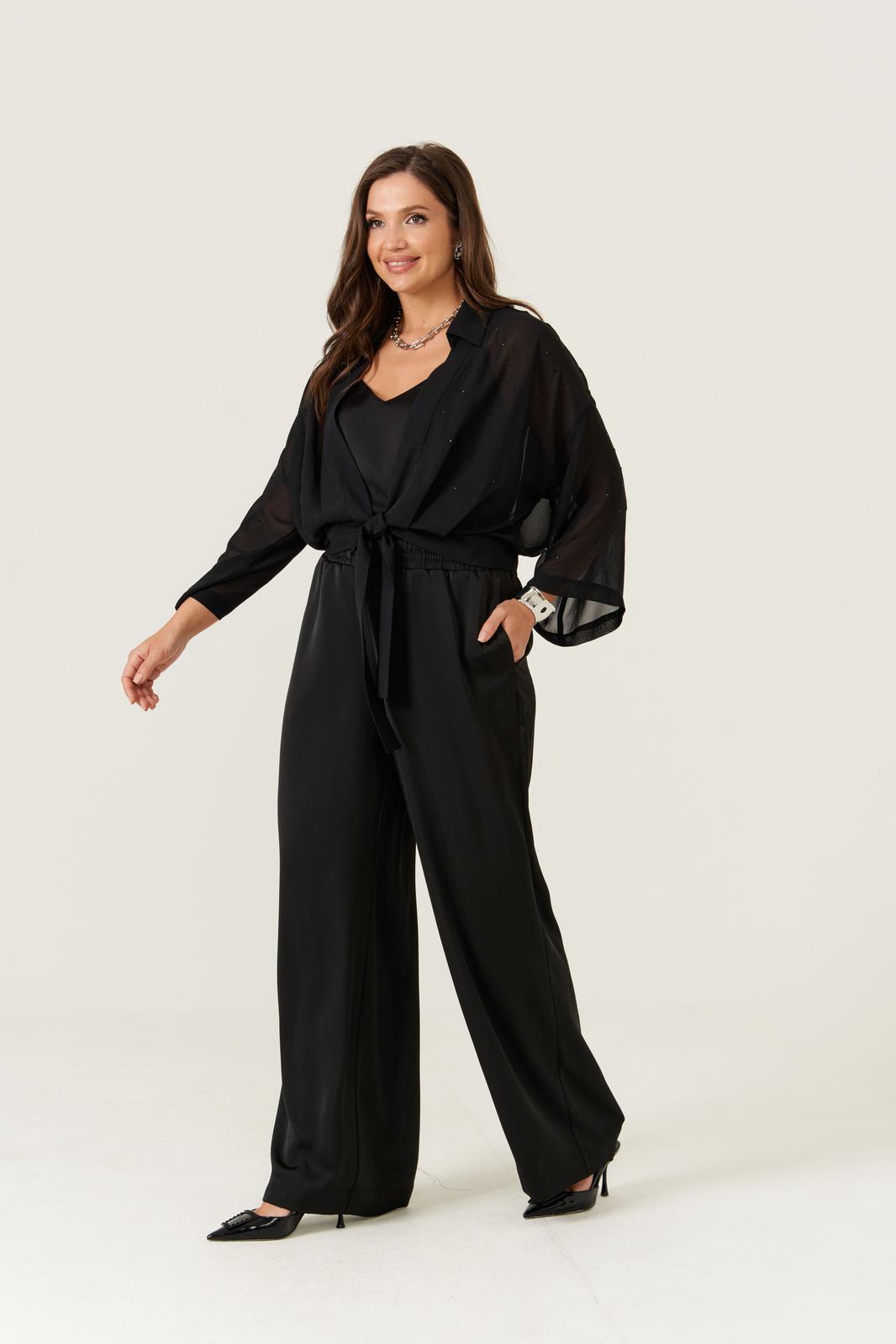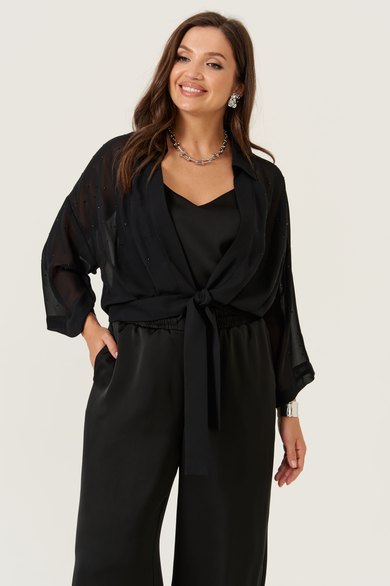 Эта женская блузка выполнена из легкой и мягкой струящейся ткани, идеально подходящей для повседневных образов. Модель обладает прямым силуэтом, обеспечивающим комфорт и стильный внешний вид. Цвет — классический черный, что делает блузку универсальной и легко сочетаемой с различными вещами. Край борта обработан планкой, а перед украшен декоративными стразами, придающими изделию изящность и немного нарядности. Передняя часть оформлена складками, что добавляет объем и интересный визуальный эффект. Низ изделия обработан притачным поясом, который завязывается для дополнительной фиксации и акцента на талии. Горловина выполнена в рубашечном стиле с отрезной стойкой, создавая аккуратный и классический силуэт. Рукава втачные, длинные, украшены декоративными стразами. Линия плеча спущена, что придает рукавам свободный и комфортный крой. Эта блузка станет отличным выбором для повседневных прогулок или неформальных встреч, добавляя вашему стилю нотки утонченности и современности.