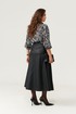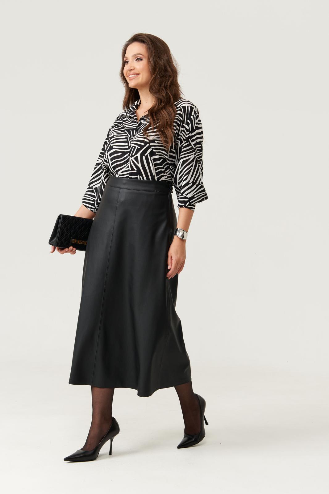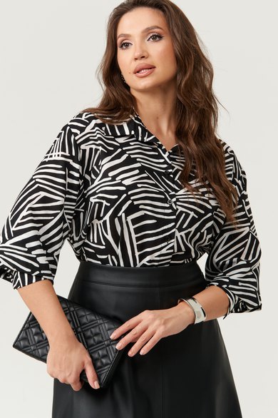 Стильная женская блузка для повседневной носки выполнена в прямом силуэте, что обеспечивает комфорт и свободу движений. Ткань легкая, струящаяся, с эффектным черно-белым принтом, придающим образу свежесть и современность. Перед украшен центральной бортовой застежкой на восемь обметанных петель и пуговиц, а низ изделия выполнен с закругленным краем, что добавляет изящества. Спинка оформлена кокеткой и двумя складками, создающими приятную посадку и аккуратный силуэт. В боковых швах расположены небольшие разрезы для удобства движений. Горловина обработана классическим воротником на стойке, а рукава завершены притачными манжетами с застежками на одну пуговицу и петлю — практично и стильно. Эта очень легкая и практичная блузка станет отличным выбором для ежедневных образов, обеспечивая комфорт и привлекая внимание своей элегантностью.