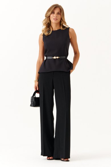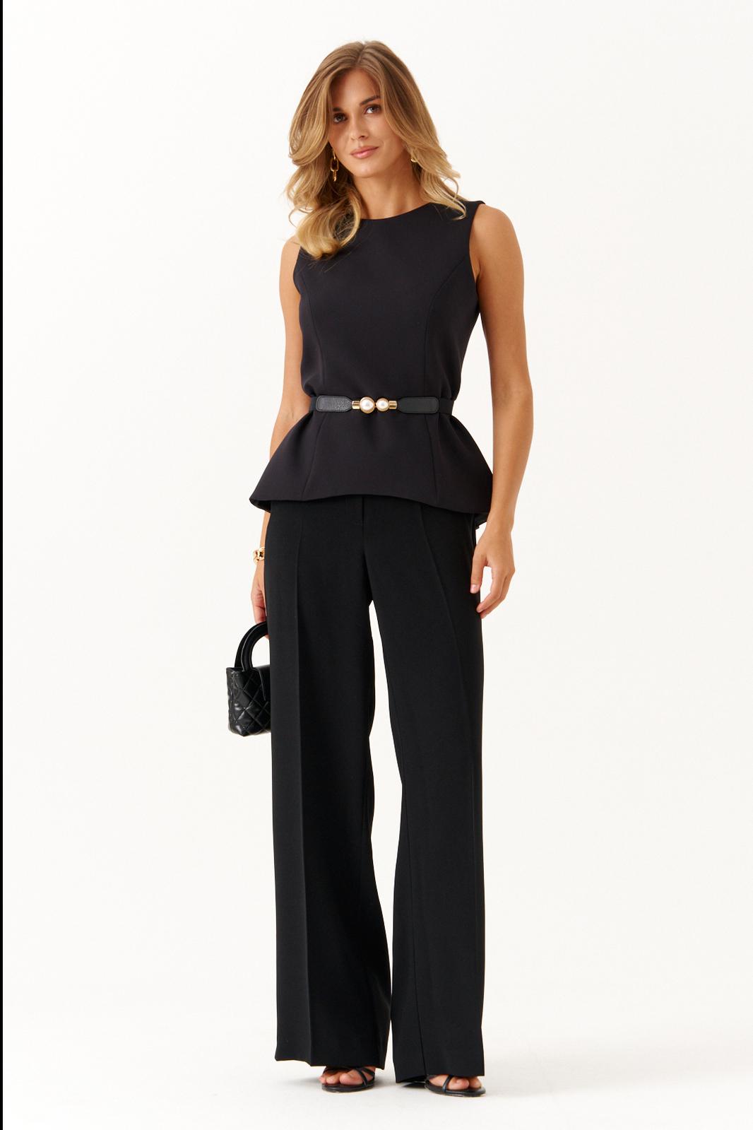 Спинка блузки также оформлена несколькими рельефами: два из них начинаются от проймы в верхней части, а ещё два – в нижней, что помогает модели хорошо сидеть по фигуре и сохранять форму. По центру спинки расположен средний шов со скрытой потайной молнией, благодаря которой блузку удобно надевать и снимать, не нарушая плавность силуэта. Расширенная горловина придаёт образу элегантность и свободу, обеспечивая комфорт даже в тёплую погоду, а отсутствие рукавов делает модель лёгкой и универсальной для сочетания с различными элементами гардероба.
