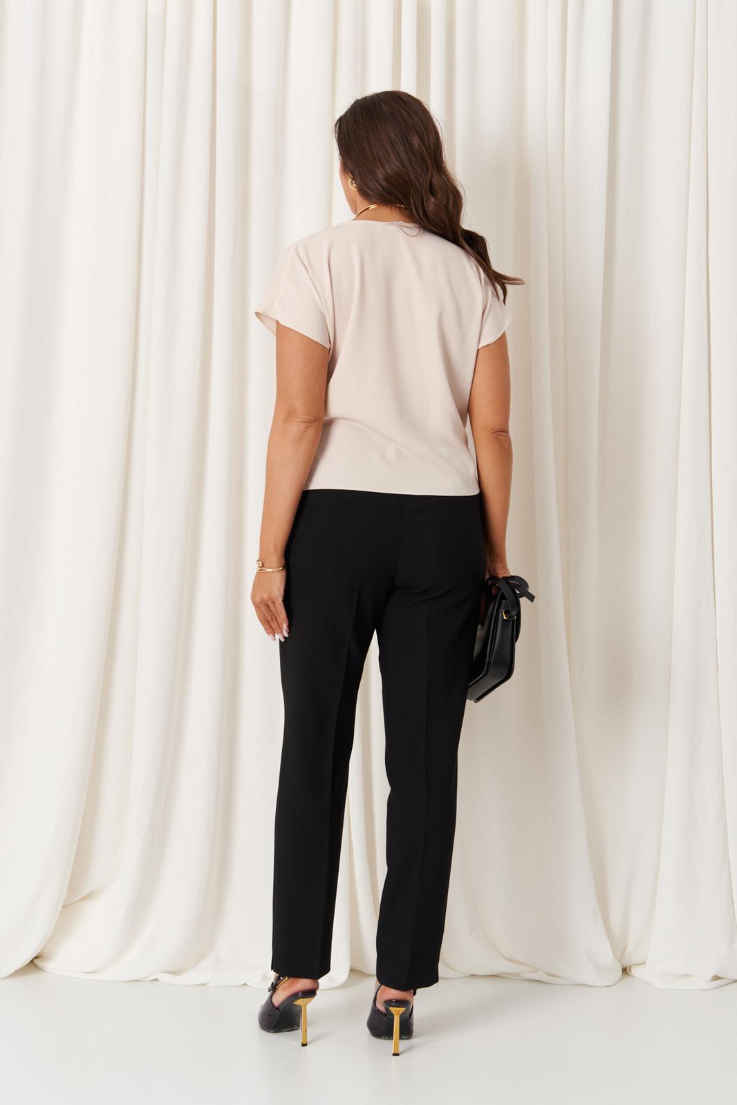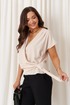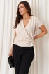Женская блузка из струящейся ткани бежевого оттенка идеально сочетает элегантность и комфорт, делая её отличным выбором для повседневного использования. Модель выполнена на запах, что обеспечивают универсальность и приятные ощущение при носке. Передняя часть украшена изящными складками, расположенными в плечевом шве, а также дополнительной складкой, создаваемой за счёт передней детали, продетой через перемычку, что придаёт изделию особый стиль и объем. Вырез горловины V-образный, он подчёркивает линию шеи и добавляет образу нежности и женственности. Короткие цельнокроеные рукава дополняют гармоничный и лаконичный дизайн. Этот оригинальный и стильный вариант блузки станет прекрасным дополнением повседневного гардероба, подходя для различных ситуаций и легко сочетаясь с различными аксессуарами и поясками.