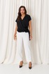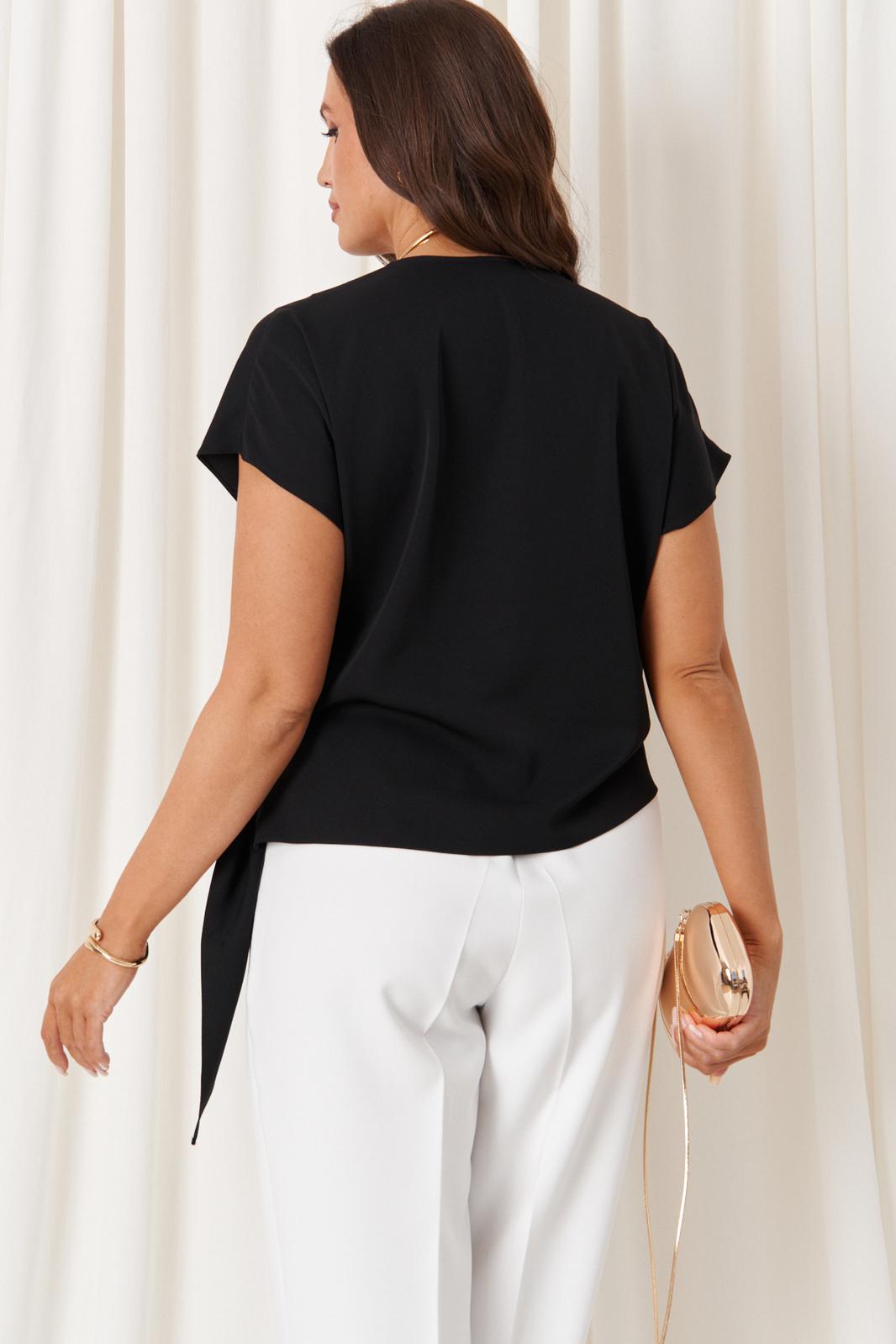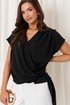 Женская блузка из струящейся чёрной ткани идеально сочетает элегантность и комфорт, делая её отличным выбором для повседневного использования. Модель выполнена на запах, что обеспечивают универсальность и приятные ощущение при носке. Передняя часть украшена изящными складками, расположенными в плечевом шве, а также дополнительной складкой, создаваемой за счёт передней детали, продетой через перемычку, что придаёт изделию особый стиль и объем. Вырез горловины V-образный, он подчёркивает линию шеи и добавляет образу нежности и женственности. Короткие цельнокроеные рукава дополняют гармоничный и лаконичный дизайн. Этот оригинальный и стильный вариант блузки станет прекрасным дополнением повседневного гардероба, подходя для различных ситуаций и легко сочетаясь с различными аксессуарами и поясками.