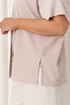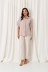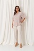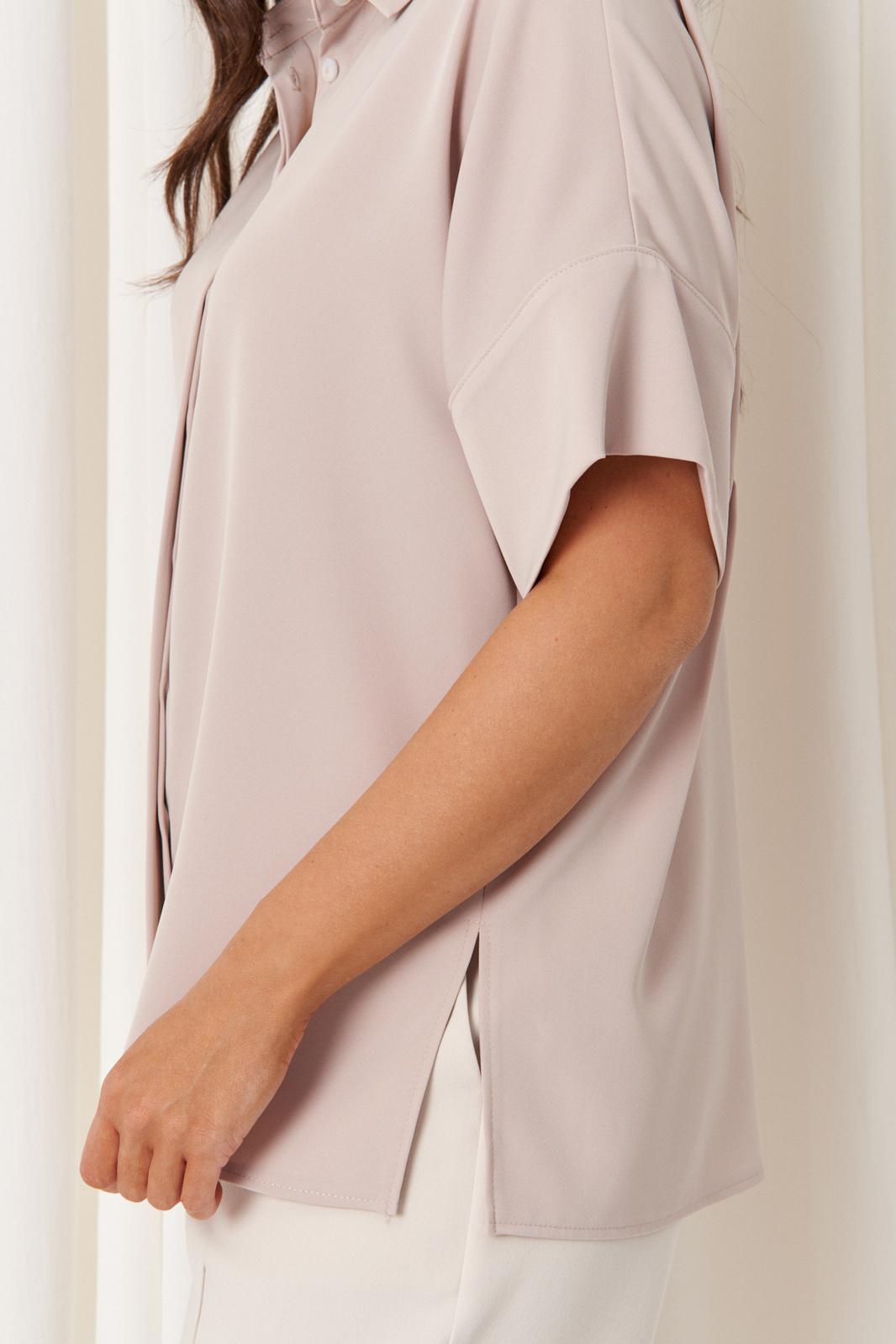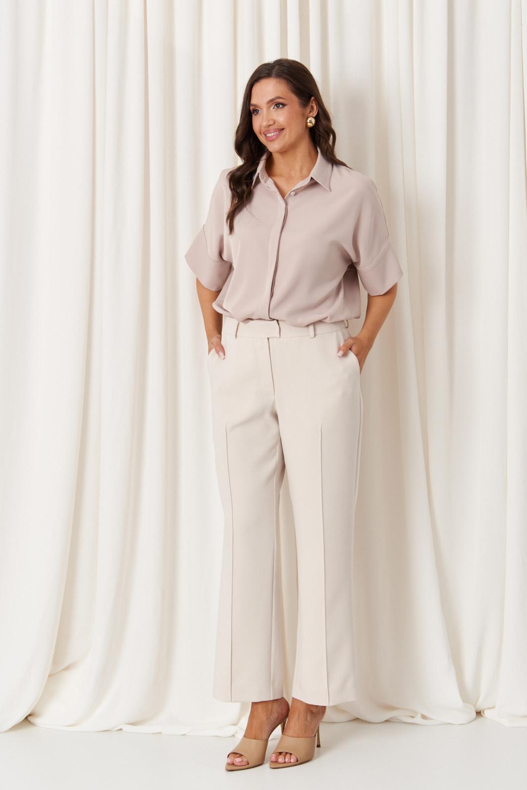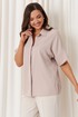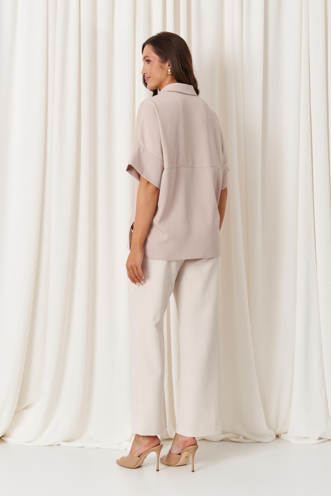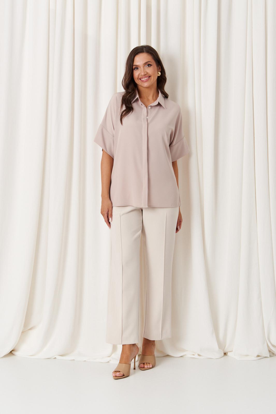 Эта женская блузка выполнена из струящейся легкой ткани, которая отлично подчеркивает изящность и комфорт. Модель выполнена в прямом силуэте, что обеспечивает свободу движений и универсальность в сочетании с различной одеждой. Застежка в блузке супатная центральная ботовая застежка на обметанные петли и пуговицы, что придает ей аккуратный и классический вид. Спинка украшена кокеткой с двумя складками, добавляя нарядности и интересных деталей к дизайну. В боковых швах расположены небольшие разрезы, которые облегчают посадку и создают дополнительное движение. Передняя часть короткая, по сравнению со спинкой, что добавляет оригинальности образу. Горловина оформлена классическим рубашечным воротником с отрезной стойкой, а линия плеча спущена, что создает более свободное и расслабленное ощущение. Рукава длинной чуть ниже локтя завершены притачной манжетой, которая аккуратно обрабатывает край. Цвет блузки — нежный бежевый, что делает ее универсальной для различных образов и подчеркивает элегантность и женственность. Эта блузка отлично подойдет для повседневных, деловых или романтичных луков, сочетаясь как с классическими брюками, так и с юбками.