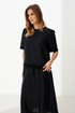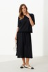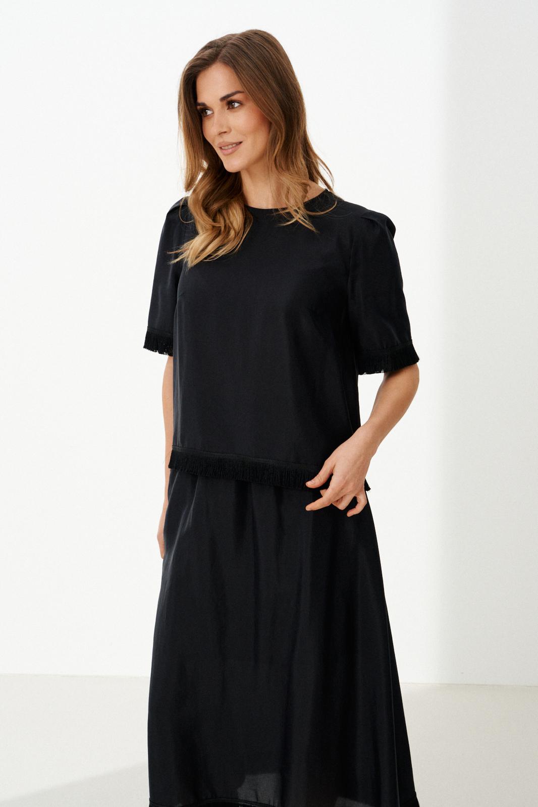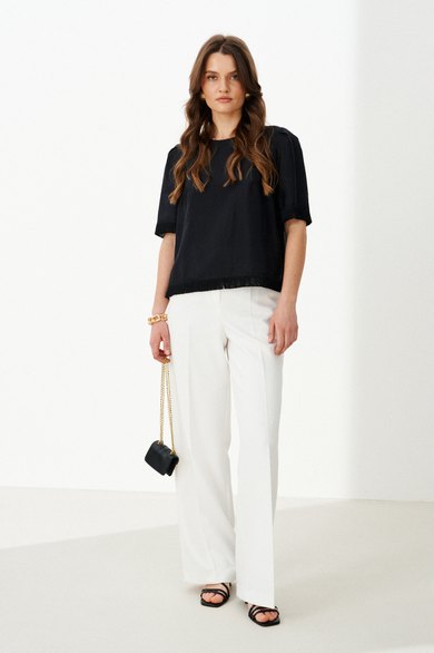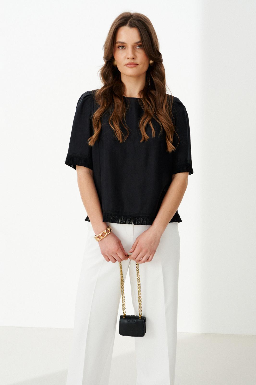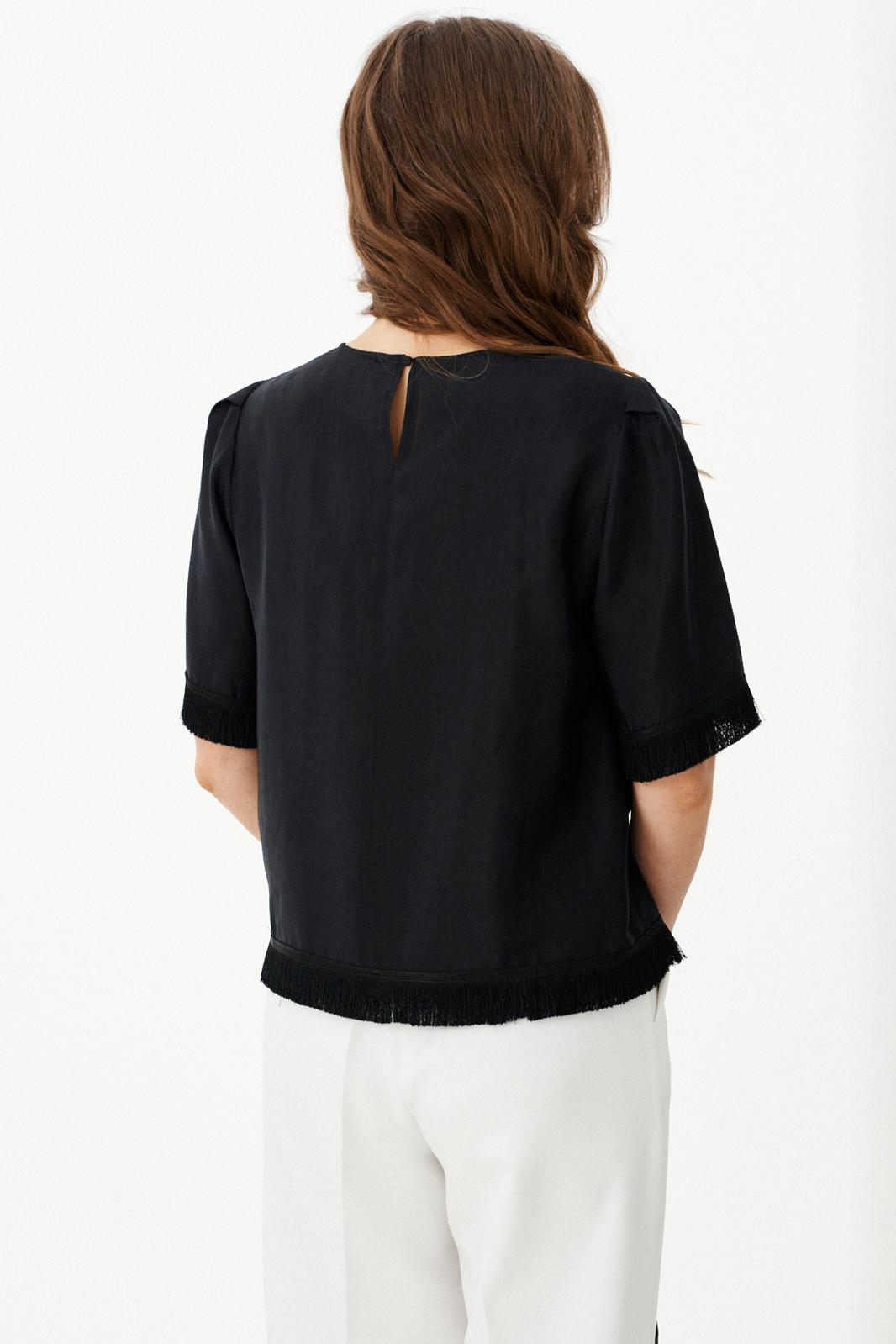 Женская блузка выполнена из легкой и приятной к телу поливискозной ткани, что делает её отличным вариантом для повседневной носки. Модель имеет прямой силуэт и расширенную горловину, обеспечивающие комфорт и свободу движений. Передняя часть украшена двумя аккуратными нагрудными вытачками, которые придают блузке аккуратную и хорошо сидящую форму. Спинка застегивается на застежку-капельку с пуговицей по среднему шву, что облегчает процесс надевания и снимает дискомфорт. По низу передней и задней части изделия проходит изящная декоративная тесьма, которая повторяется и на рукавах, придавая модели стильные и утончённые акценты. Рукава втачные, длиной до уровня локтя, создают гармоничный и сбалансированный образ. Классический чёрный оттенок, универсален и легко впишется в любой гардероб, позволяя сочетать изделие с разной обувью и аксессуарами. Эта блузка — отличный выбор для повседневного элегантного образа, подчеркивающего женственность и стиль.