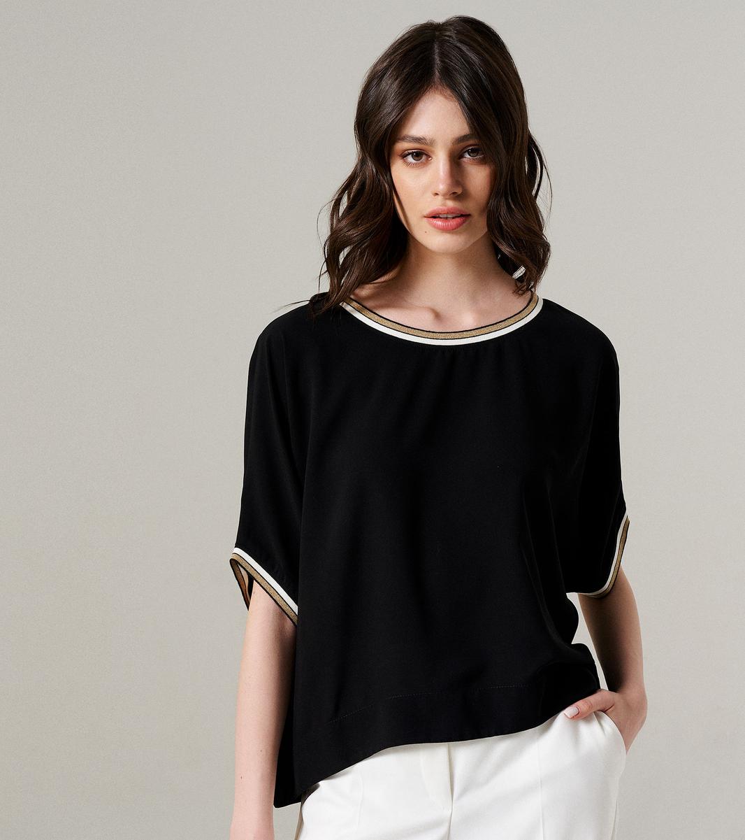 Блуза женская из легкой струящейя ткани для повседневной носки. Изделие свободного кроя с коротким цельнокроеным рукавом. Блуза классической длины со средним швом по спинке. По горловине и рукавам довязы.