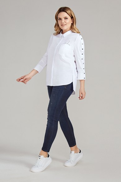 Стильная и очень эффектная рубашка для офиса и на каждый день.Сочетание строгой классики и элементов спорта помогает создать динамичный и молодёжный образ в рамках дресскода.Рукав длиной 3/4 будет удобен в тёплое время года,Застёжки в виде планок с петлями и пуговицами на рукавах смотрятся очень современно и освежают образ. Рубашечный воротник на стойке и потайная застёжка спереди,карман на груди,неровная линия низа,шлицы по переду ,смещённый в сторону переда боковой шов,отрезная кокетка по спинке и складки от неё- всё это гармонично сочетается и дополняет друг друга. Графичный принт в виде города является изюминкой рубашки и наверняка понравится современной ,не стоящей на месте и развивающейся личности.