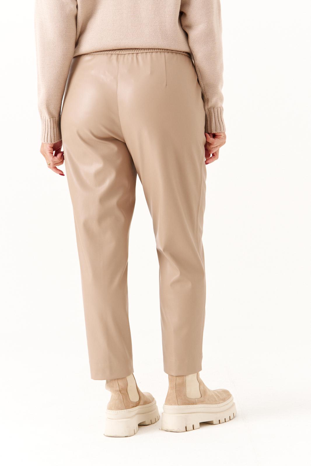 Женские брюки из кожаной ткани — стиль и комфорт на каждый день. Эти женские брюки выполнены из мягкой и приятной на ощупь кожаной ткани бежевого цвета — идеальный выбор для повседневного образа с изысканным акцентом. Модель оснащена притачным поясом с эластичной резинкой, которая обеспечивает комфортную и надежную посадку по талии. Передняя часть украшена аккуратными застроченными стрелками, визуально удлиняющими силуэт. По бокам расположены удобные карманы с подкройным бочком, а в боковых швах выполнены небольшие разрезы, придающие модели лёгкость и динамичность. Эти брюки прекрасно сочетаются с базовыми и яркими элементами гардероба — от расслабленных футболок до элегантных блуз и жакетов. Создайте универсальный образ, который подчеркивает вашу индивидуальность и стиль.