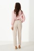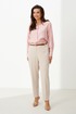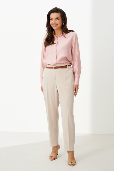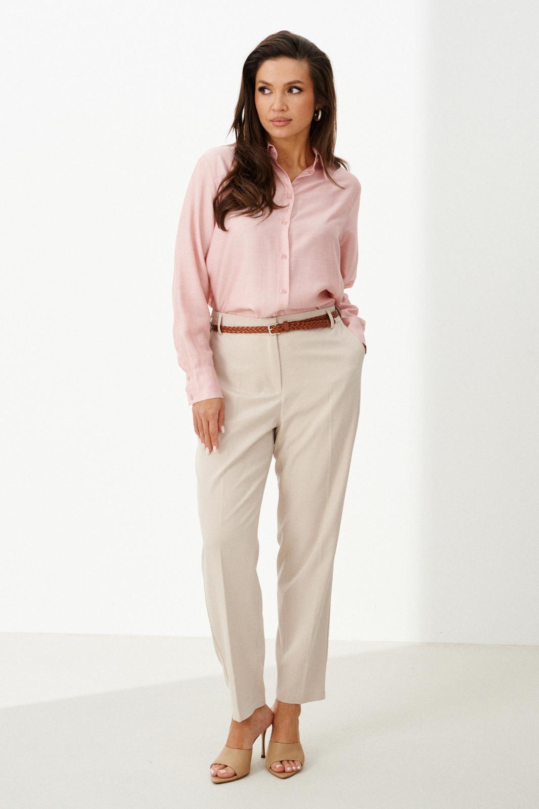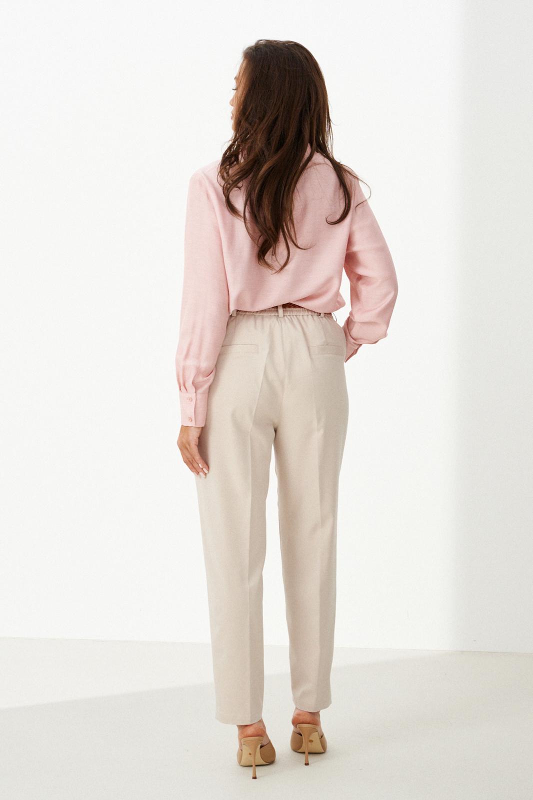 Данные женские брюки выполнены из мягкой вискозной ткани, что обеспечивает приятное ощущение и комфорт при носке. Верхний срез брюк оформлен притачным поясом, дополненным вставкой на резинке в задней и боковых частях, что позволяет добиться идеальной посадки и свободы движений. В задней части брюк расположены две талиевые вытачки, придающие форму и подчёркивающие линию талии. Задние карманы с листочками добавляют изделию эстетическую завершенность и функциональность, а боковой шов с карманом с подкройным бочком обеспечивает дополнительную практичность. Брюки заужены к низу, создавая современный и стройный силуэт. Застежка выполнена на крючок и молнию, расположенные в среднем шве, что обеспечивает удобство и надежность в использовании. В комплект входит пояс, который можно использовать для дополнения образа или для дополнительной регулировки посадки. Цвет брюк — бежевый, универсальный и легко сочетаемый с другими предметами гардероба, делая их подходящим вариантом для повседневных и деловых образов.