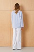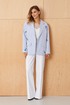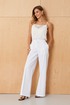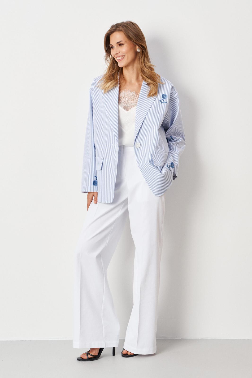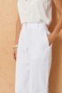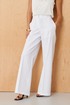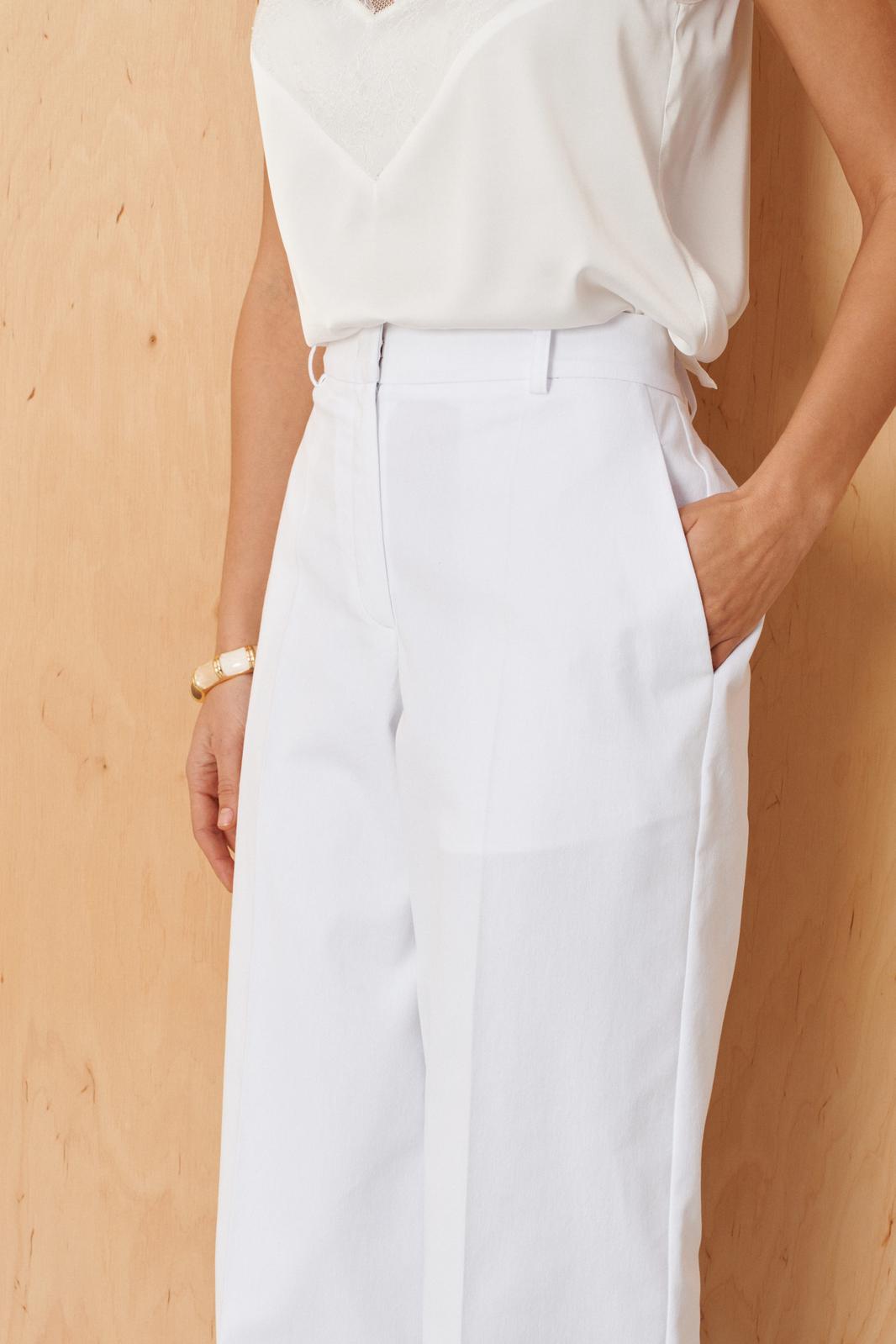 Это женские прямые брюки, выполненные из джинсовой ткани с большим добавлением хлопка, что обеспечивает комфорт и прочность изделия. Верхний срез брюк обработан аккуратным притачным поясом, который фиксируется при помощи застежки на крючок и молнии, расположенной в среднем шве. Задняя часть брюк украшена талиевыми вытачками, которые подчеркивают талию и создают аккуратную посадку. В боковых швах расположены прорезные карманы с подкройным бочком, обеспечивающие практичность и дополнительный стильный элемент. Модель выполнена в белом оттенке, что делает эти брюки универсальным и свежим вариантом для повседневного гардероба.