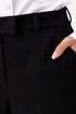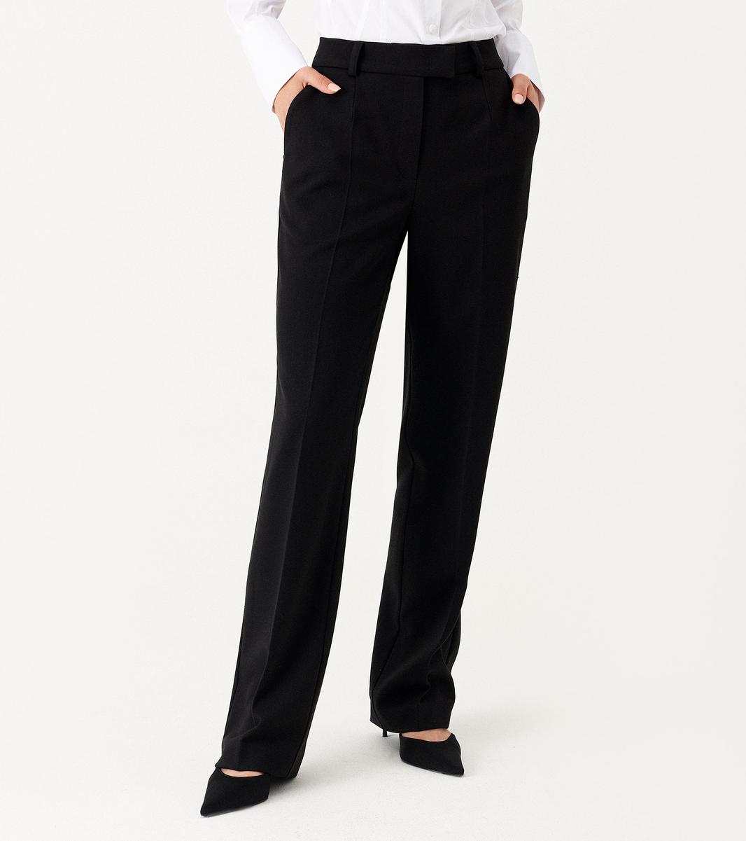 Брюки женские из поливискозной ткани для повседневной носки. Брюки прямые, слегка зауженные. На передней части брюк есть боковые карманы. Верх брюк обработан отрезным поясом, застёгивающийся на тесьму-молнию и потайной крючок. На задней части брюк есть талиевые вытачки и прорезные карманы. Ткань однотонная.