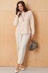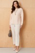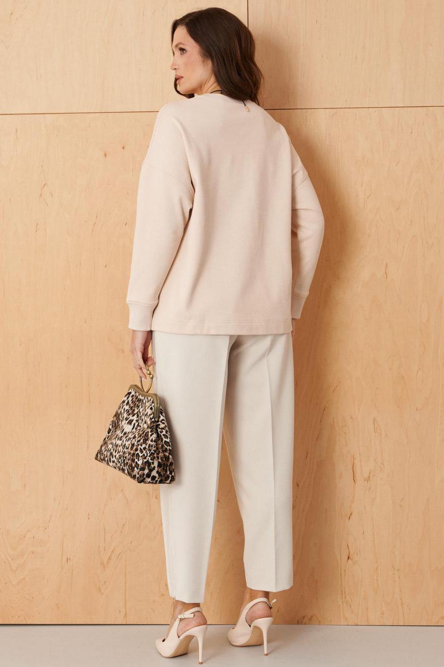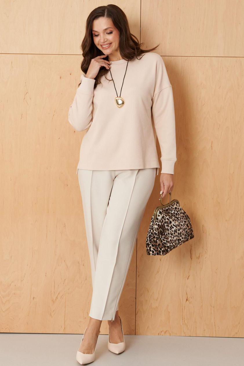 Джемпер женский из смесового трикотажного полотна с добавлением хлопка. Джемпер прямого силуэта. По переду низ изделия короче, чем по спинке с разрезами в боковом шве. Горловина обработана планкой из довяза. Низ рукава обработан манжетой на довязе, рукава длинные, а также по низу рукава имеется дизайнерская вышивка в виде надписи. Джемпер подойдет для любого рода мероприятий.