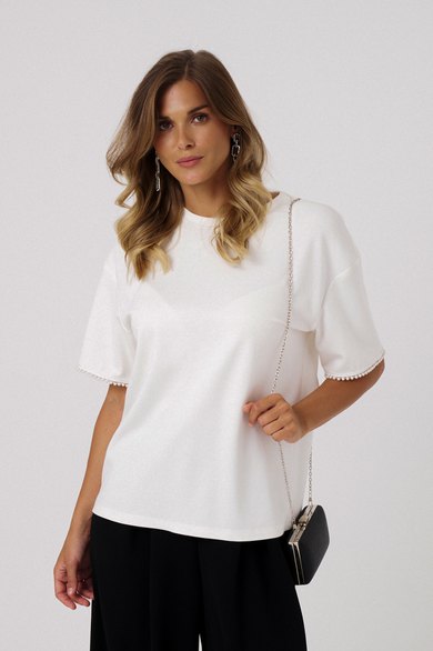 Женский джемпер молочного цвета из мягкого трикотажного полотна, созданный для комфортной повседневной носки. Модель характеризуется удобной посадкой и современным дизайном. Чуть расширенная горловина обеспечивает свободу движений и ощущение легкости, а немного опущенная линия плеча придает образу расслабленность и актуальность. Рукава втачные, длиной до локтя, низ рукава украшен декоративной тесьмой с бусинами, добавляющей изящный акцент. Этот джемпер станет прекрасным выбором для создания уютных и стильных повседневных образов.