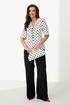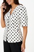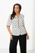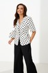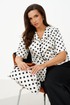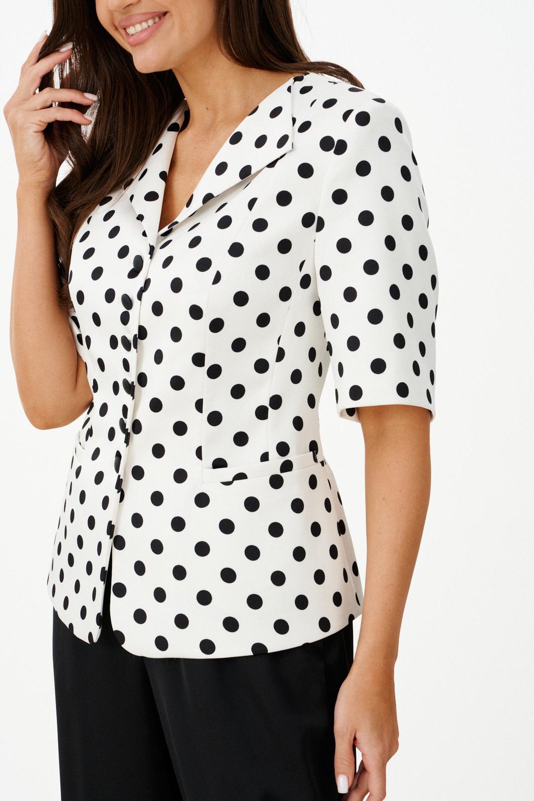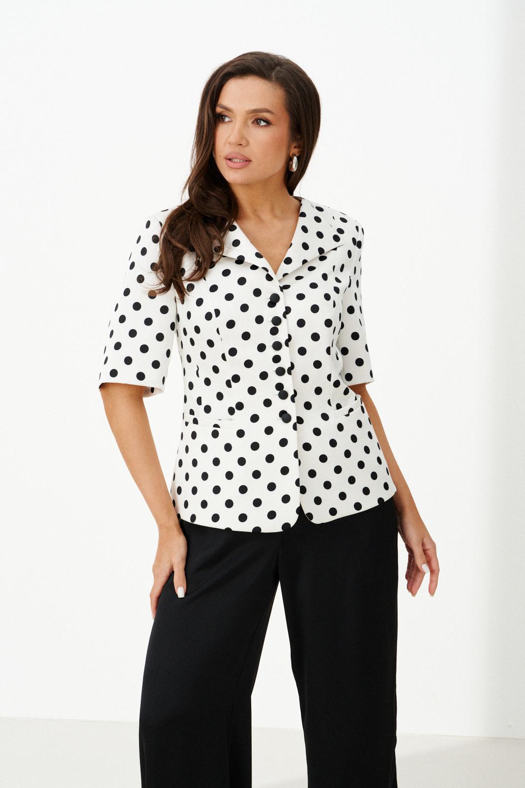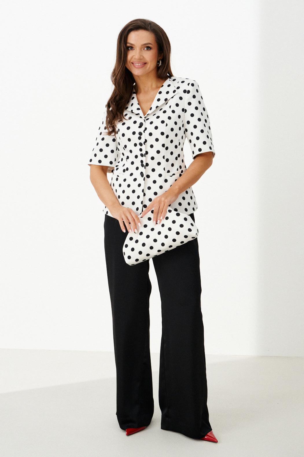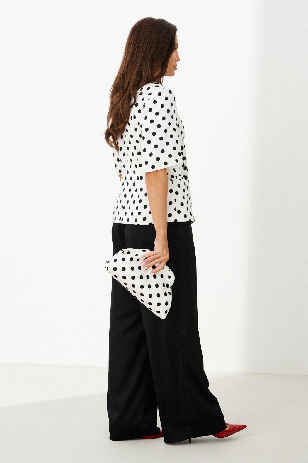 Этот женский костюм выполнен из атласной ткани и идеально подходит для повседневной носки. Комплект состоит из жакета и брюк, создает элегантный и стильный образ. Жакет полуприлегающего силуэта с центральной застежкой на обметанные петли и пуговицы. Передняя часть украшена двумя рельефами и карманом с листочкой. Спинка оформлена средним швом и двумя рельефами, идущими из плечевых швов до линии низа, что подчеркивает форму. Горловина по переду украшена лацканами, а по спинке обработана обтачкой, что делает дизайн аккуратным и завершенным. Втачные рукава длиной чуть ниже локтя добавляют комфорта и стиля. Жакет на хлопковой подкладке. Жакет с принтом в горошек добавляет образу яркости и оригинальности. Брюки прямого кроя, верхний срез брюк обработан притачным поясом с вставкой на резинке обеспечивая удобство и свободу движений. В боковых швах есть потайные карманы, что делает их практичными. Цвет костюма — классический черно-белый, он отлично подойдет как для офиса, так и для повседневных мероприятий, подчеркивая вашу элегантность и хороший вкус.