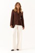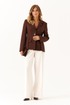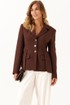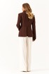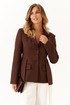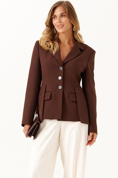 Жакет женский шоколадного оттенка из смесовой ткани предназначен для повседневной носки и выполнен в полуприлегающем силуэте. Он застегивается по центральной бортовой линии с помощью обметанных петель и пуговиц. Передняя часть жакета украшена двумя талиевыми вытачками и двумя рельефами, которые начинаются от проймы и продолжаются до линии подреза, что обеспечивает хорошую посадку и форму. На передней части расположены два кармана с клапанами и обтачками, а также декоративная деталь, придающая изделию стильный вид. Спинка жакета выполнена со средним швом и украшена декоративной деталью, которая идет от линии подреза по талии. Также на спинке есть две талиевые вытачки и два рельефа, начинающихся от проймы и продолжающихся до линии подреза по талии, что способствует более аккуратной посадке изделия по фигуре.