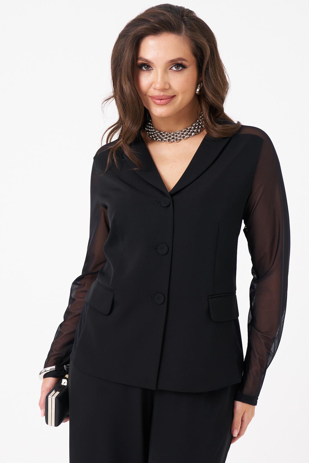 Это женский жакет из сочетания легкой костюмной ткани и сетки, выполненный в прилигающем силуэте. Модель отличается элегантным и утонченным дизайном, подходящим как для повседневных, так и для торжественных образов. Цвет жакета — насыщенный черный, что делает его универсальным и стильным элементом гардероба. Центральная бортовая застежка на обметанные петли и пуговицы, создающая аккуратный внешний вид. Передняя часть украшена двумя прорезными карманами с листочками, добавляющими функциональности и декоративности. По переду расположены две талиевые вытачки, подчеркивающие фигуру и создающие стройный силуэт. Спинка оформлена со средним швом и кокеткой из сетчатого материала, придающей образу легкость и оригинальность. Горловина обработана воротником-шаль, мягко обрамляющим плечи. Длинные рукава выполнены из сетчатого материала, гармонично сочетающегося с основной тканью жакета. Модель оснащена эластичной подкладкой для комфортного ношения.