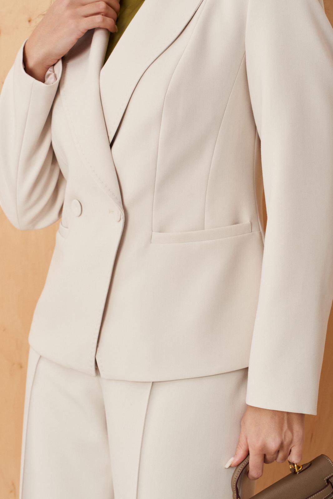 Женский жакет из поливискозной ткани в бежевом оттенке отлично подойдет для повседневной носки. Его полуприлегающий силуэт обеспечивает комфорт и стиль, а крою характерны криволинейная линия борта и аккуратная обработка. Передняя часть украшена рельефами и двумя карманами с листочкой, что дополнительно подчеркивает элегантность изделия. Застежка двубортная на обметанные петли и пуговицы придает жакету классический вид, в то время как воротник пиджачного типа добавляет изысканности. Спинка выполнена с средним швом и двумя вертикальными рельефами, идущими от плечевого шва до линии низа, что создает стройный силуэт. Длинные втачные рукава и отделочные строчки по воротнику и краю борта завершают дизайн, делая жакет стильным и аккуратным.