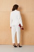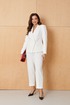 Женский жакет из поливискозной ткани в молочном оттенке отлично подойдет для повседневной носки. Его полуприлегающий силуэт обеспечивает комфорт и стиль, а крою характерны криволинейная линия борта и аккуратная обработка. Передняя часть украшена рельефами и двумя карманами с листочкой, что дополнительно подчеркивает элегантность изделия. Застежка двубортная на обметанные петли и пуговицы придает жакету классический вид, в то время как воротник пиджачного типа добавляет изысканности. Спинка выполнена с средним швом и двумя вертикальными рельефами, идущими от плечевого шва до линии низа, что создает стройный силуэт. Длинные втачные рукава и отделочные строчки по воротнику и краю борта завершают дизайн, делая жакет стильным и аккуратным.