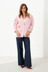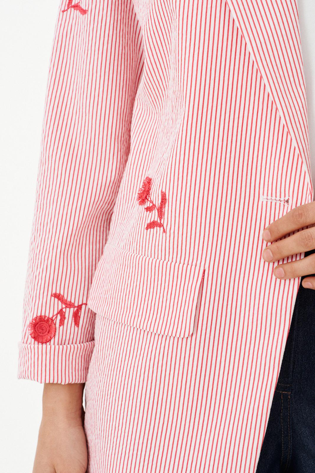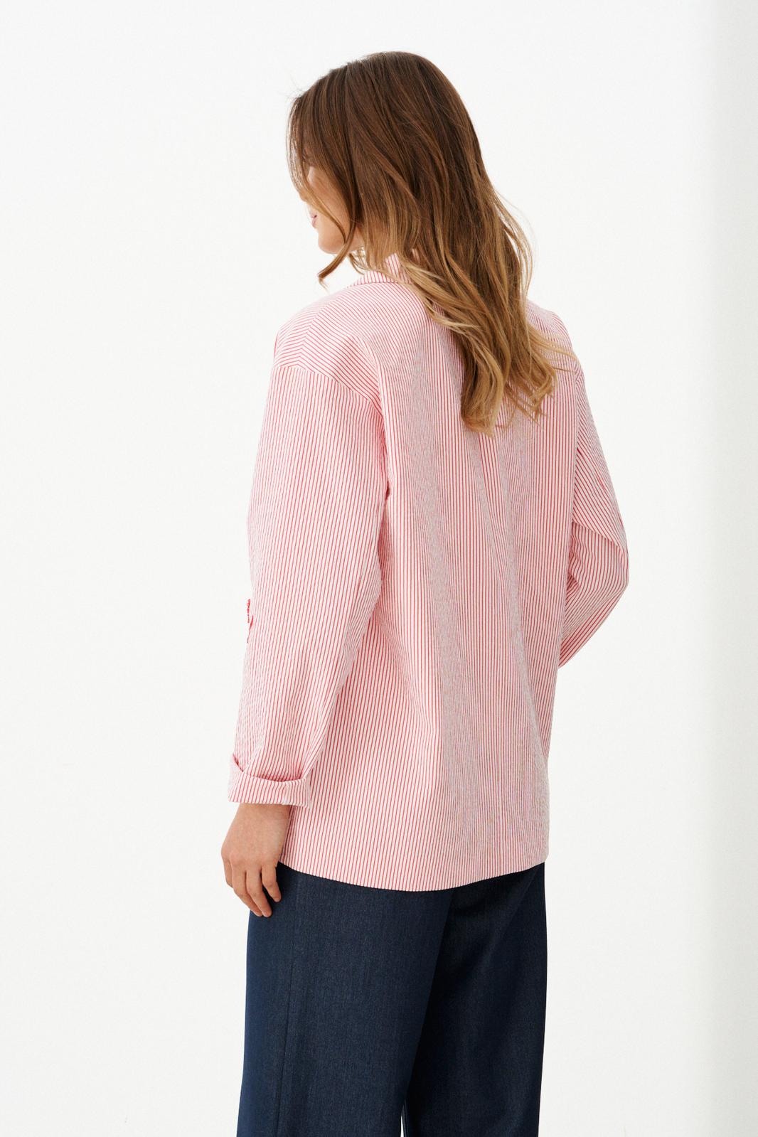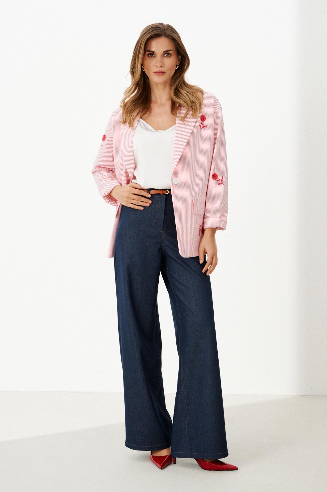 Этот женский жакет выполнен из костюмной ткани с добавлением хлопка, что делает его одновременно элегантным и приятным к телу. Жакет на качественной хлопковой подкладке. Модель имеет центральную бортовую застежку на обметанную петлю и одну пуговицу, обеспечивая удобство и аккуратность посадки. Передняя часть украшена дизайнерской вышивкой в виде цветов, которая придает изделию изысканный и нотки утонченности. На передней части также располагаются накладные клапаны, имитирующие карманы, что создает эффект обманки — элемент декоративной отделки, добавляющий интересный акцент к дизайну. Спинка жакета выполнена с центральным швом, что обеспечивает хорошую посадку и структурированность модели. Горловина обработана пиджачным воротником, придающим жакету классический стиль и эффект завершенности. Длинные втачные рукава позволяют свободно двигаться и создают аккуратный внешний вид. Жакет выполнен в бело-красном оттенке с полоской, что делает его универсальным и стильным элементом гардероба, подходящим для различных повседневных и деловых образов.