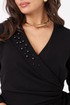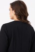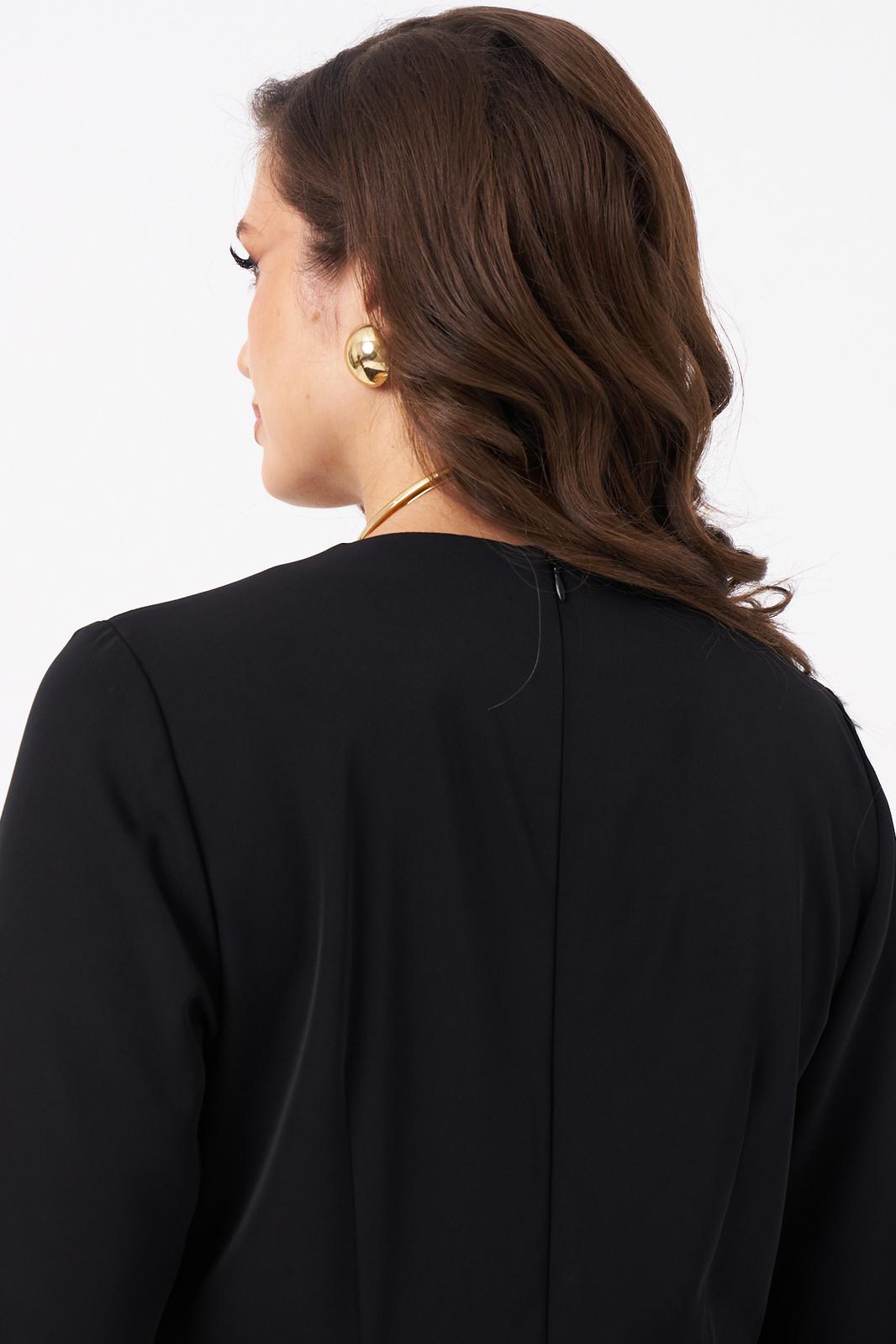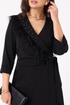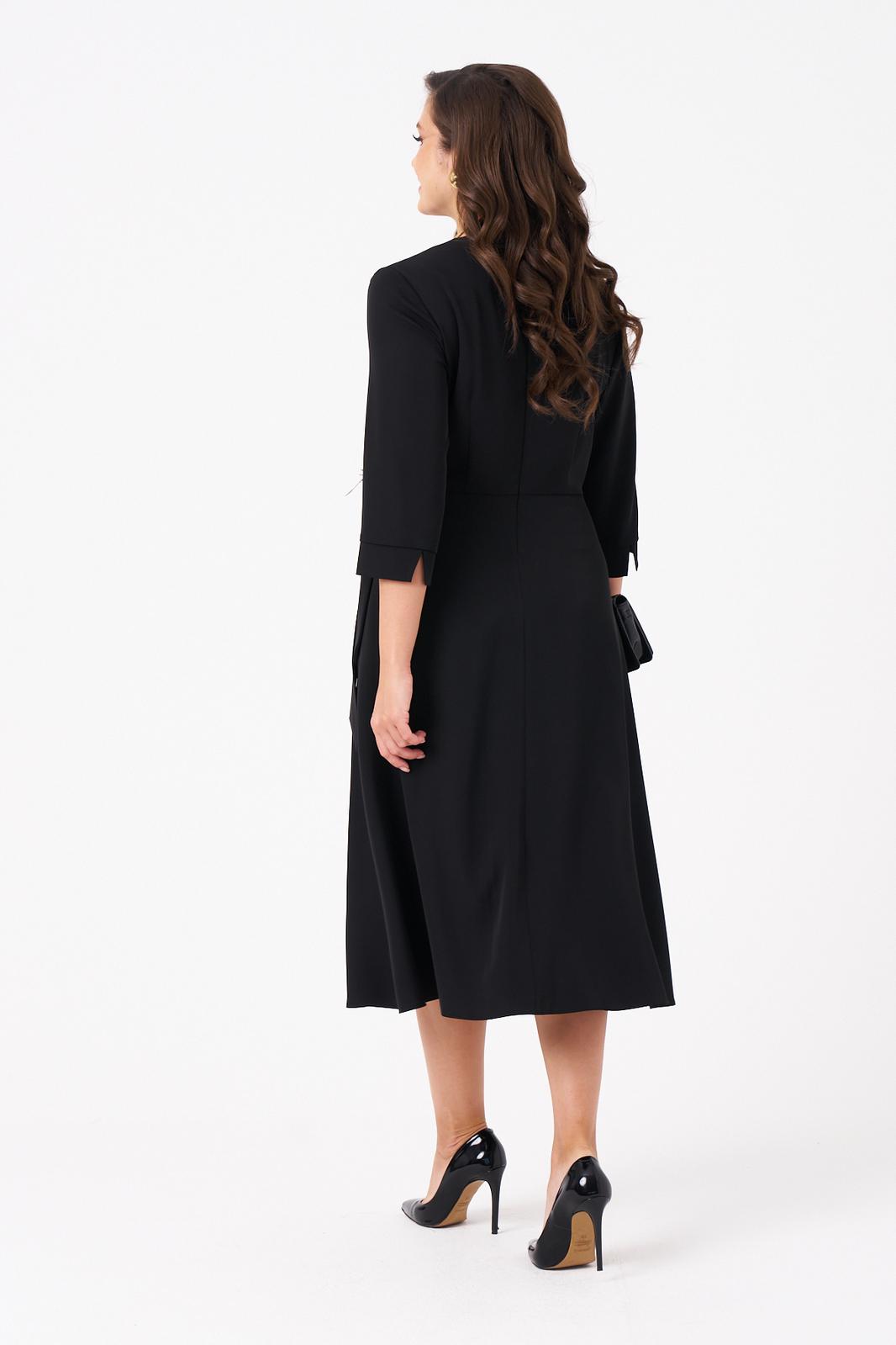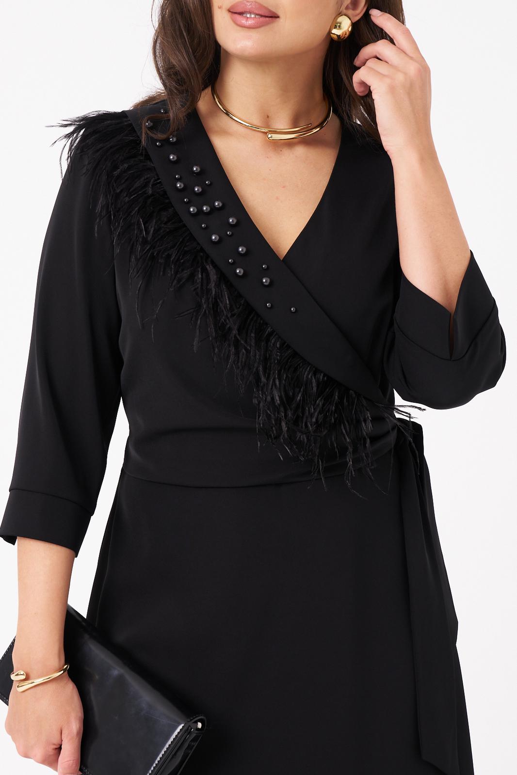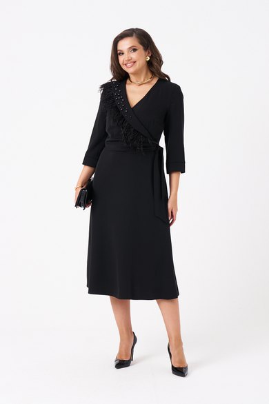 Женское платье из поливискозного волокна, предназначенное для повседневной носки. Модель выполнена в полуприлегающем силуэте с имитацией жакета на запах и отрезной линией талии, что подчеркивает фигуру. Лиф украшен нагрудной вытачкой, а спинка — средним швом с двумя талиевыми вытачками и потайной молнией для удобства. Юбка расширяется к низу, создавая элегантный силуэт. Воротник — V-образный с шалью, украшенной декоративными бусинами и по краю воротника перьями, которые прижелании можно отстегнуть.. Рукава втачные, длиной ниже локтя, обеспечивают комфорт и стиль. Длина платья — макси. Модель выполнена на качественной вискозной подкладке. Изящное платье чёрного цвета подойдёт для торжественных случаев.