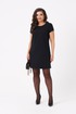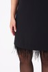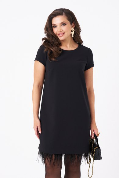 Это женское платье из поливискозной ткани, предназначенное для повседневной носки. Перед имеет две нагрудные вытачки, что придает изделию аккуратный и стройнящий силуэт. Спинка выполнена со средним швом и оснащена потайной застёжкой-молнией в шве для удобства надевания. Нижняя часть платья украшена декоративными перьями, добавляющими оригинальности и изящества образу. Перья крепятся на тесьму с кнопками, что позволяет отстёгивать их перед стиркой либо носить платье без них. Горловина, расширенная создает комфортное облегание и стильный вид. Короткие втачные рукава с фигурным низом делают платье практичным и легким в носке. Цвет изделия — классический черный, что делает его универсальным и подходящим для различных случаев.