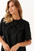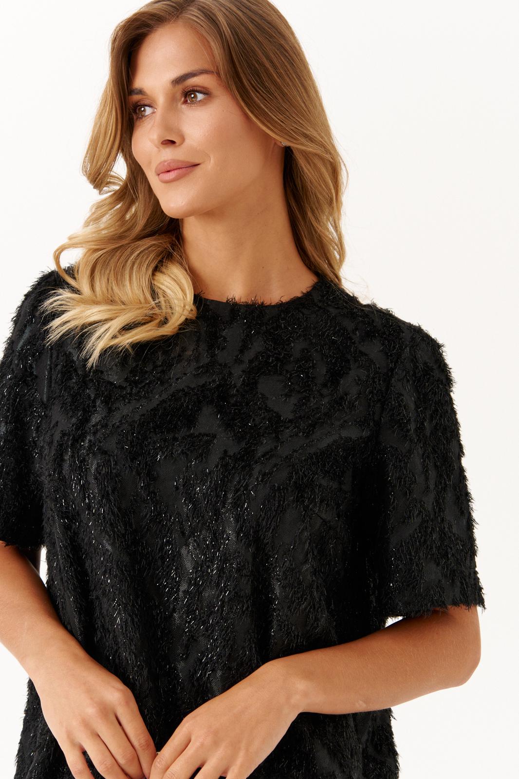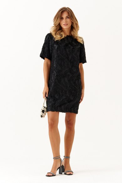 Женское платье из поливискозной ткани с фактурой «травка» предназначено для повседневной носки. Модель выполнена прямого силуэта, что обеспечивает комфорт и свободу движений. На передней части платья расположены две нагрудные вытачки, придающие изделию аккуратную посадку по фигуре. Спинка имеет средний шов, застежку «капельку» и небольшой разрез для удобства при ходьбе. Платье полностью на поливискозной подкладке, что повышает комфорт при носке. Расширенная горловина и короткие втачные рукава дополняют образ, придавая ему лёгкость и элегантность. Длина платья — миди, цвет — классический чёрный, что делает модель универсальной и подходящей для различных повседневных ситуаций.