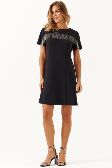 Платье женское из поливискозной ткани. Современное платье длиной миди идеально сочетает комфорт и стиль. Модель имеет слегка расширенный силуэт, обеспечивающий свободу движений, и чуть расширенную горловину для дополнительного комфорта. Особенность дизайна — фигурный шов на передней части с декоративной тесьмой с цепочкой, которая элегантно продолжается на рукав. Два вертикальных рельефа на переде и два на спинке создают визуальный интерес и придают образу современную расслабленность. Спинка модели с средним швом со скрытой молнией для удобства. Рукава длиной чуть выше локтя. Это универсальное платье чёрного цвета станет отличным выбором как для ежедневной носки, так и для особых случаев.