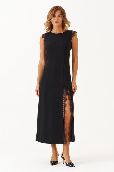 Женское платье из струящейся ткани — идеально для повседневного образа. Чёрное макси-платье, выполненное из мягкой и удобной струящейся ткани, отлично подойдет для ежедневной носки. Модель отличается криволинейной линией по переду и двумя нагрудными и талиевыми вытачками, что создает элегантный силуэт. Передняя нижняя часть платья украшена разрезом с кружевными вставками, добавляющими нежности и женственности. Спина с средним швом, застежкой-молнией и талиевыми вытачками обеспечивает хорошую посадку. Расширенная горловина и короткие рукава с декоративной кружевной отделкой делают образ еще более утонченным и женственным.