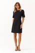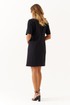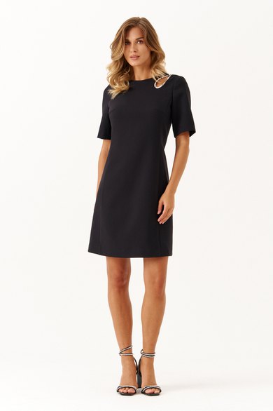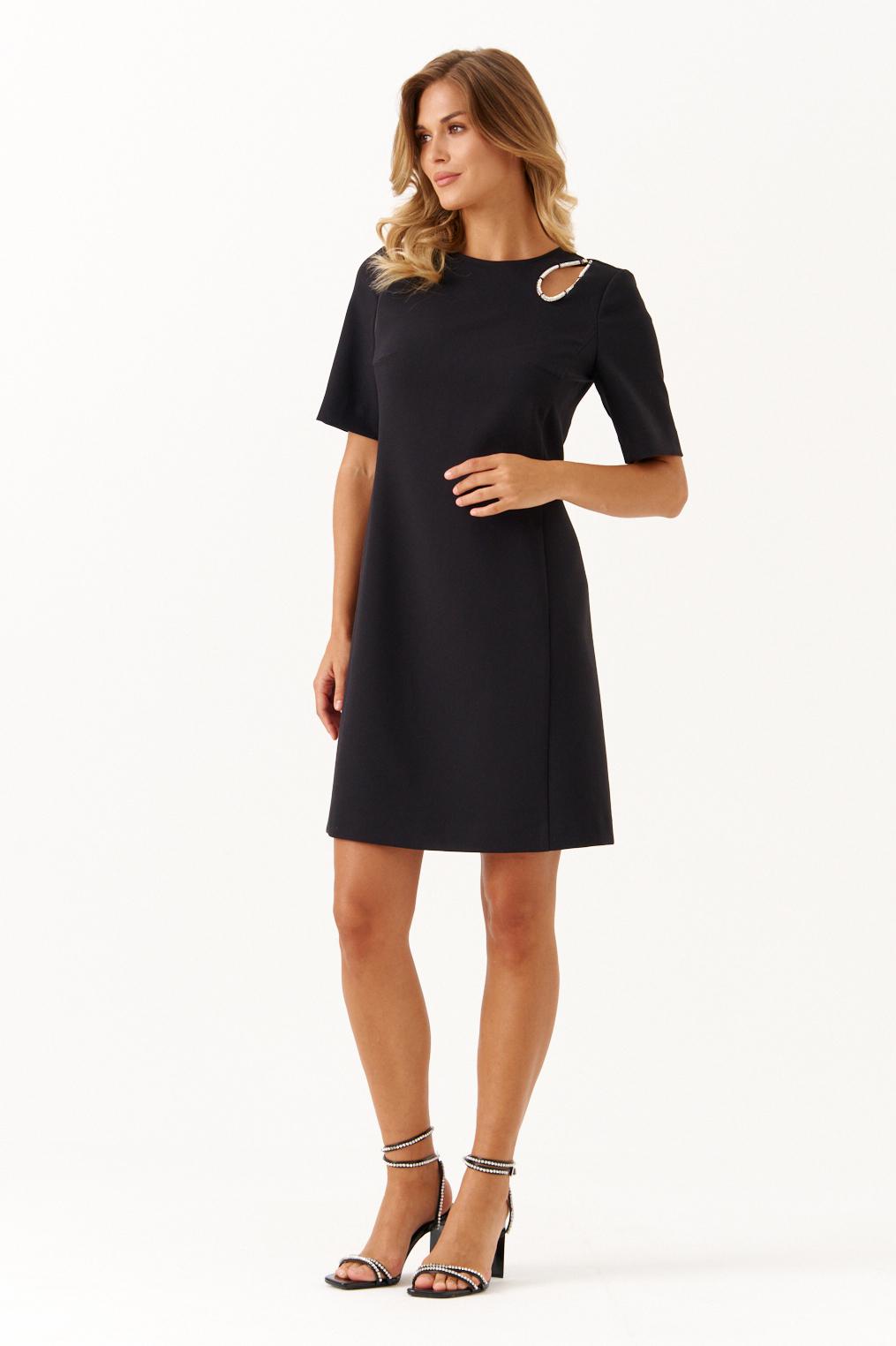 Это женское платье из поливискозной ткани предназначено для повседневной носки, сочетая комфорт и стиль. Модель выполнена в полуприлегающем силуэте, что обеспечивает аккуратную посадку и приятное ощущение при носке. Передняя часть украшена двумя нагрудными вытачками, которые отлично подчеркивают линию груди и придают платью стройный силуэт. Также на передней части расположена декоративная капелька, обведенная шнуром со стразами, что придает образу изящности и небольшого акцента блеска. Горловина чуть расширенный, создавая мягкий и элегантный вырез, приятный к телу. Рукава втачные длиной до локтя обеспечивают комфорт в теплую погоду и подходят для ежедневных образов. Задняя часть платья украшена средним швом и оснащена молнией, встроенной в шов, что облегчает надевание платья, одновременно сохраняя аккуратность силуэта. В платье есть бочок, обеспечивающие хорошую посадку и форму изделия. Длина миди делает его универсальным и подходящим как для работы, так и для прогулок или неформальных встреч. Черный цвет усиливает элегантность и универсальность модели, позволяя сочетать платье с различными аксессуарами и обувью, создавая разнообразные образы для любой ситуации.