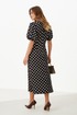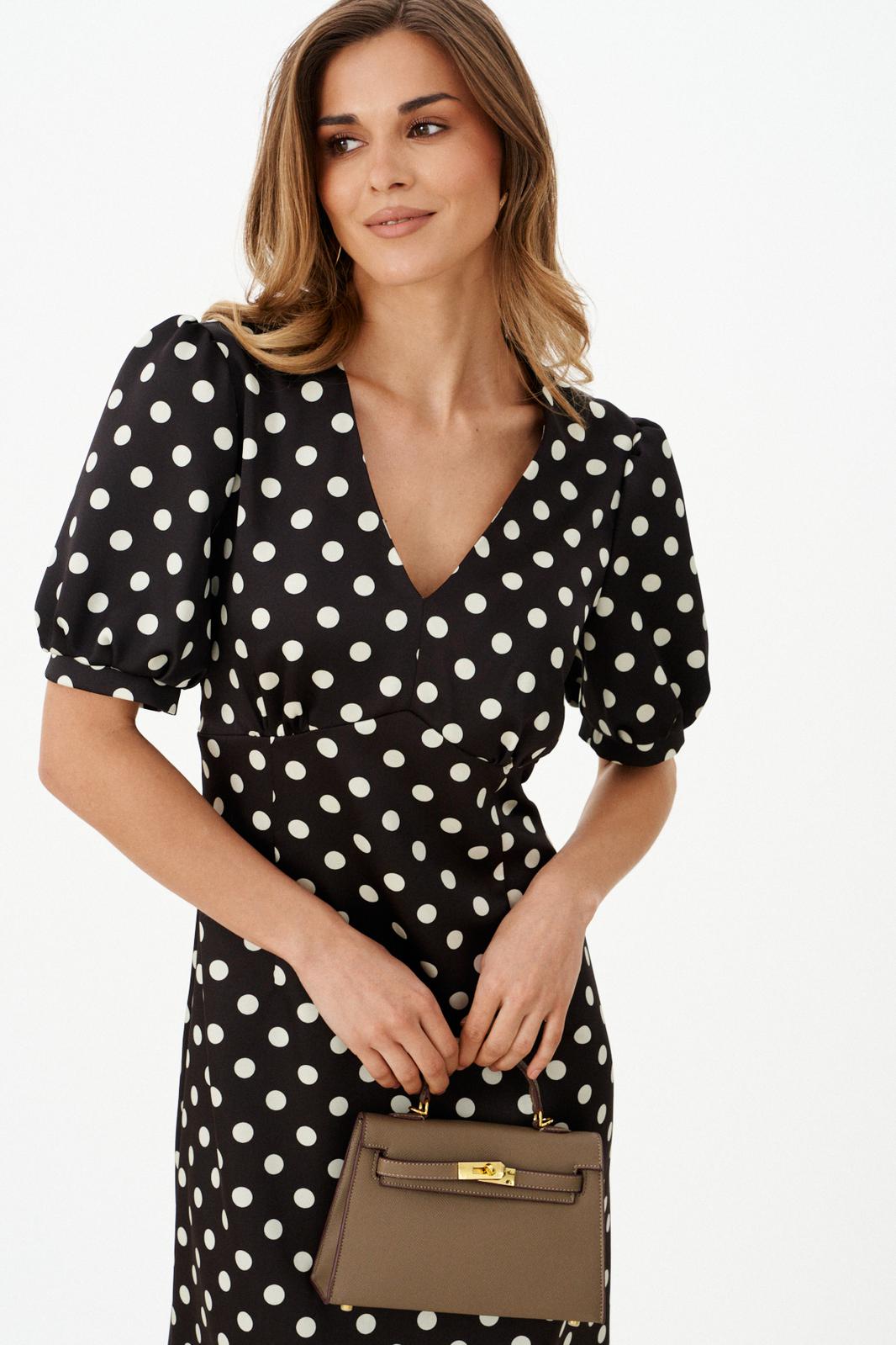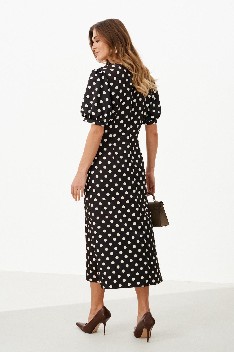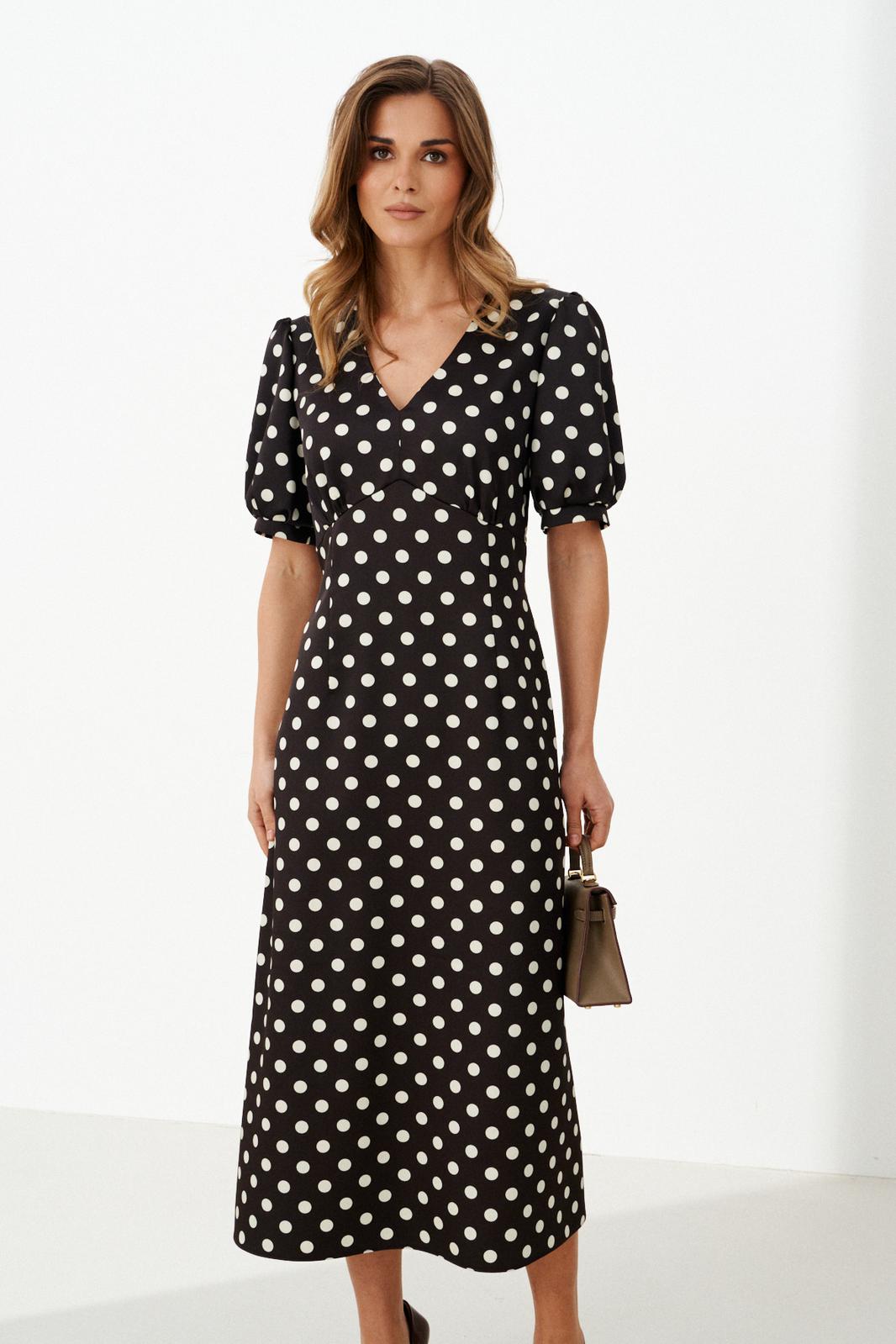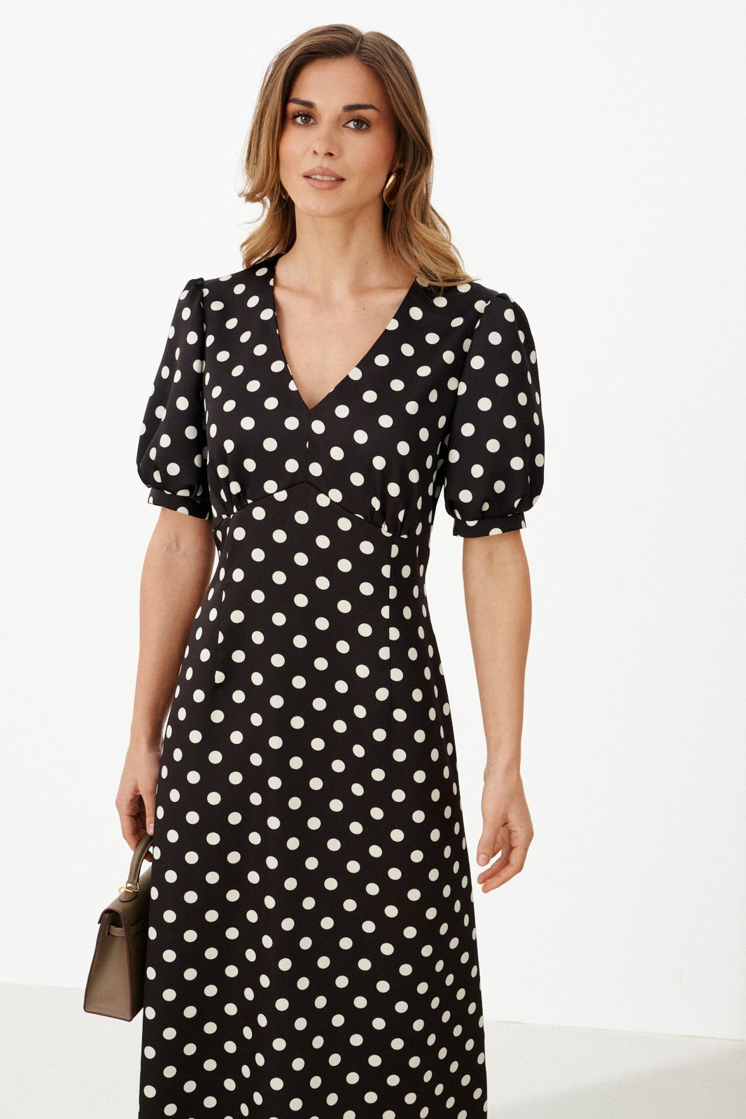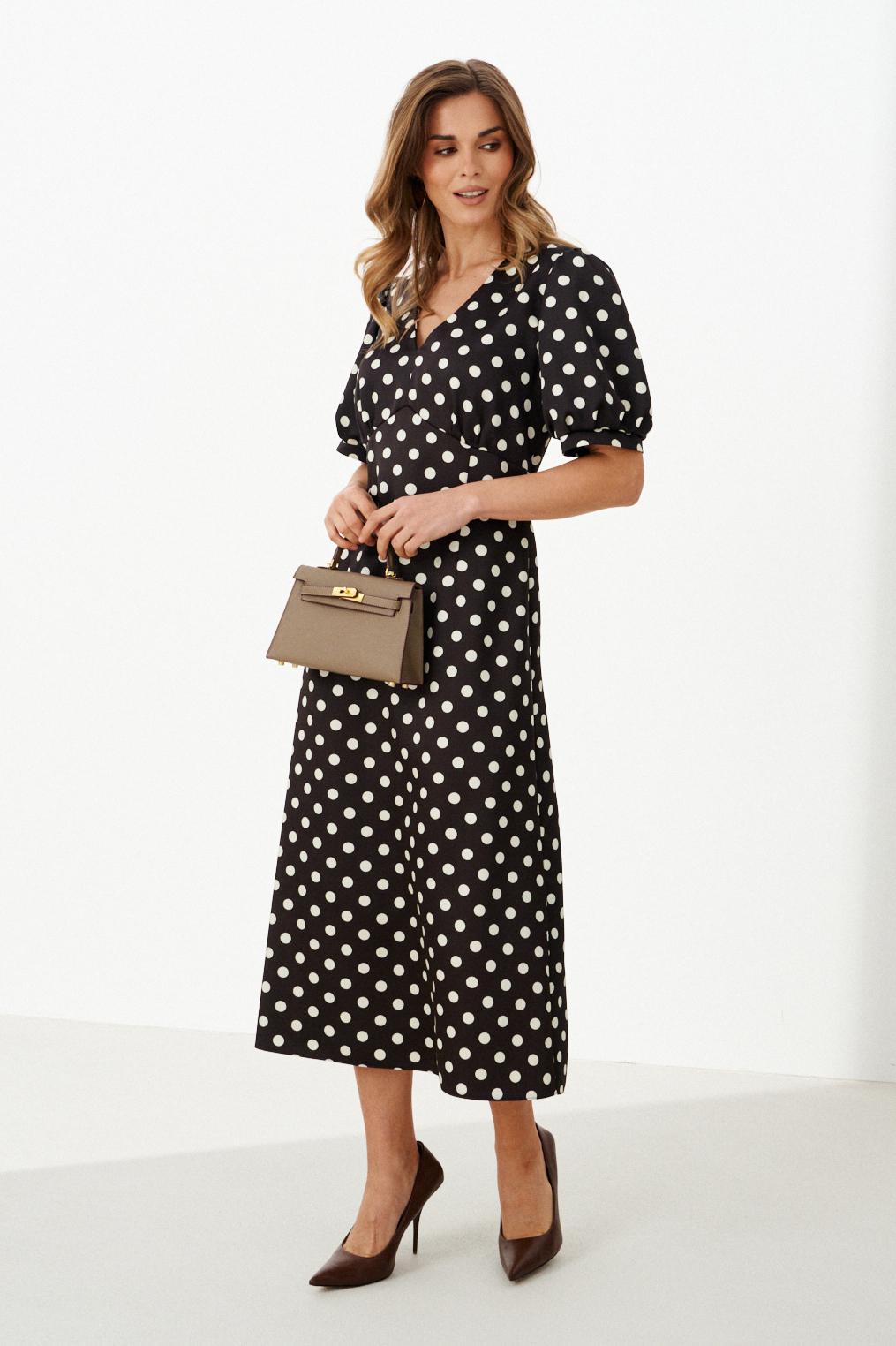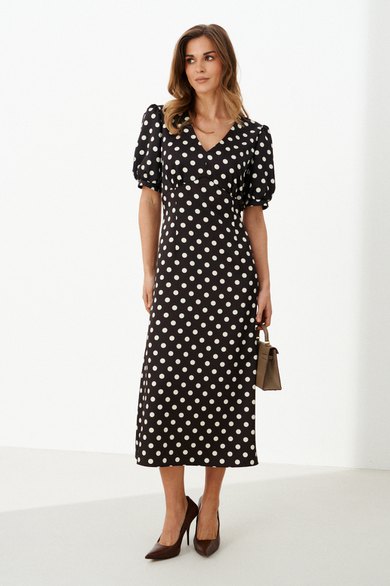 Женское платье из атласной ткани коричневого оттенка в горошек отличается элегантным и женственным кроем. Спереди платье имеет фигурный подрез под грудью с небольшой сборкой, что добавляет мягкости и легкости силуэту. Переднее полотнище юбки украшено двумя талиевыми вытачками и слегка расширяется книзу, придавая образу изящество и плавность. Спинка платья выполнена с средним швом и двумя талиевыми вытачками, обеспечивающими идеальную посадку по фигуре. В боковом шве для упрощения надевания присутствует потайная застежка-молния. Горловина оформлена в виде изящного V-образного выреза, который визуально удлиняет шею и подчеркивает зону декольте. Рукава втачные, длиной на уровне локтя, с нижним срезом, обработанным притачной манжетой со сборкой, что придаёт рукавам интересную фактуру и объем. Дополнительная деталь — сборка по окату рукава. Длина платья макси создаёт утончённый и изысканный образ, который идеально подойдет как для повседневной носки, так и для торжественных случаев.