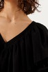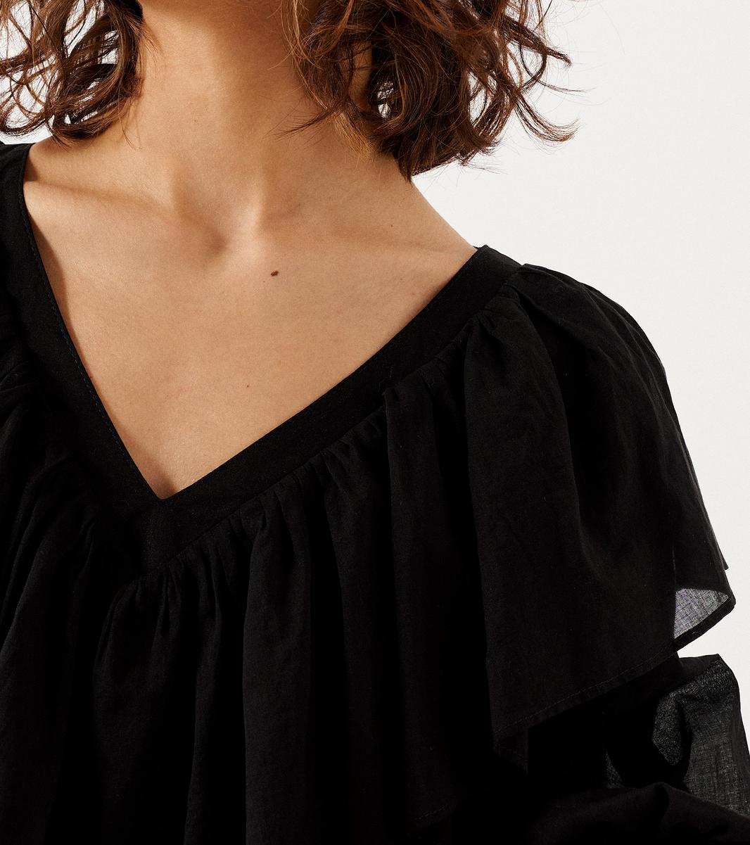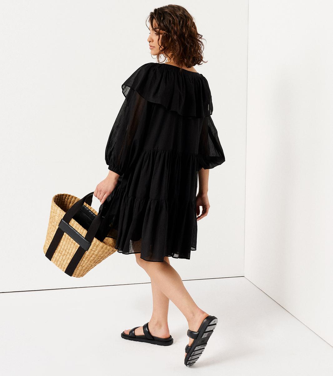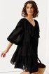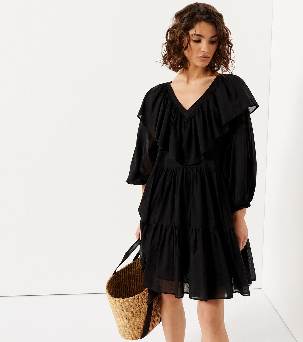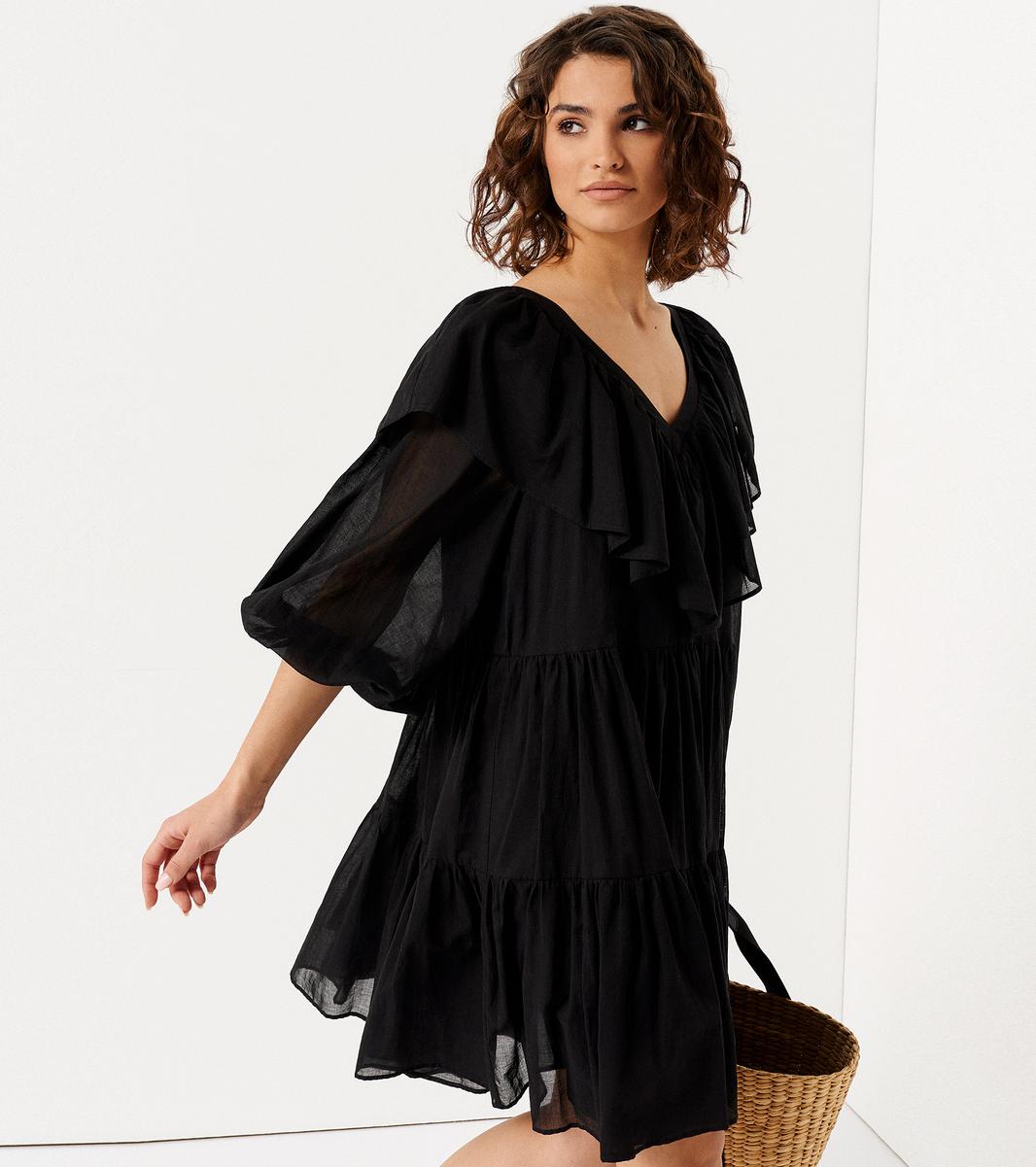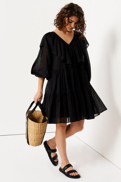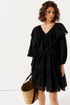 Платье из хлопковой ткани для повседневной носки. Изделие свободного силуэта с V- образной горловиной. Рукав укороченый оформлен притачной манжетой на резинке. Горловина оформлена рюшей. Длина изделия до колена.